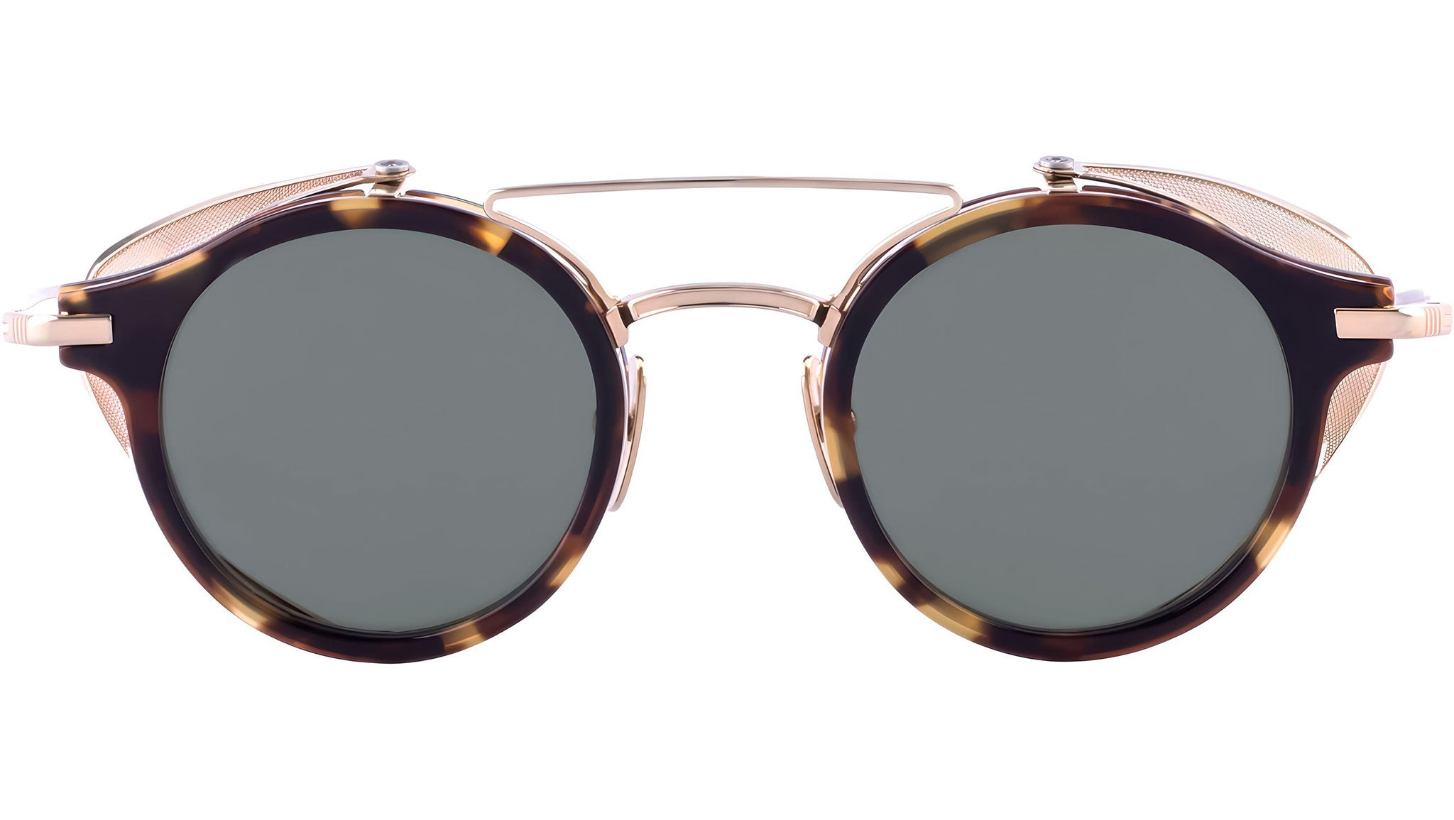 The Thom Browne eyewear collection, always true to its American DNA and inspired by mid-century aesthetics, is perfect for those who appreciate a sleek and sophisticated look; the UES804A 215 model features honey tortoise acetate and 12k gold-plated titanium, green lenses, a unique round shape with side shields, signature 4-bar detailing, striped enamel temple tips, and is elegantly presented in an eco-leather case, making it an ideal choice for individuals who exude confidence and wish to tell a story through their fashion statement.