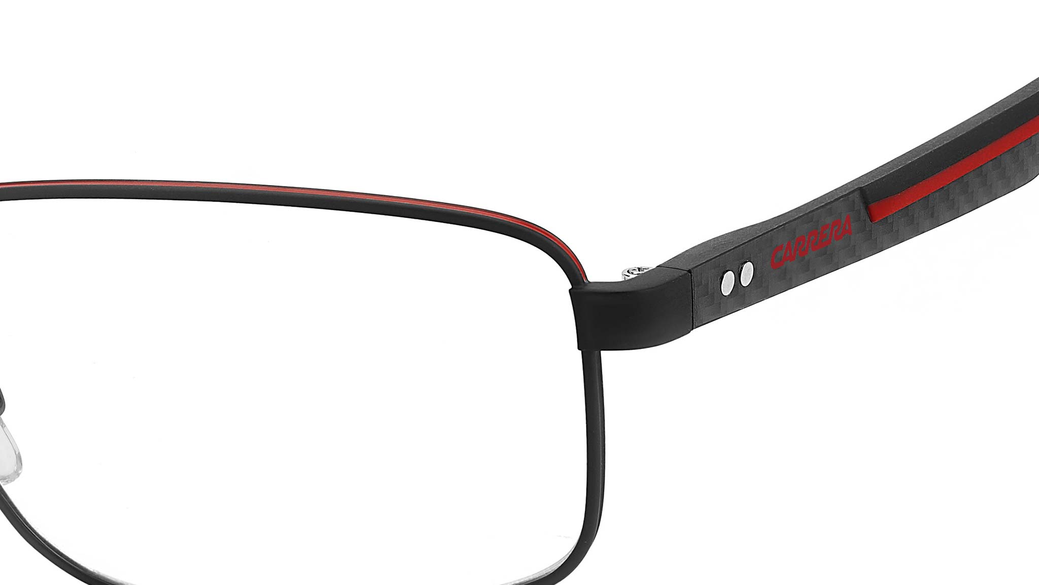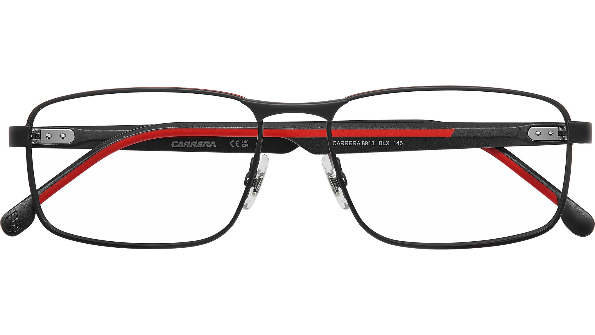 Occhiali da vista Carrera 8913 BLX uomo con montatura rettangolare in metallo nero opaco rosso e lenti demo. Carrera sceglie la fibra di carbonio per un occhiale da vista di qualità premium. Applica questo materiale leggero e resistente alle aste silm con design texturizzato. Aumentano il comfort i terminali gommati, con colorazione a contrasto oppure tono su tono. Lo sguardo è fisso sul traguardo dei propri obbietti, vestito dal frontale rettangolare in leggero acciaio inossidabile con naselli regolabili. Per uno stile concreto, senza fronzoli né distrazioni. Linea: Sport. Codice modello: 109526. Codice colore: BLX. Rivenditore autorizzato Carrera online. Gli occhiali vengono consegnati con custodia e accessori originali e sono coperti dalla garanzia ufficiale di 12 mesi del produttore.