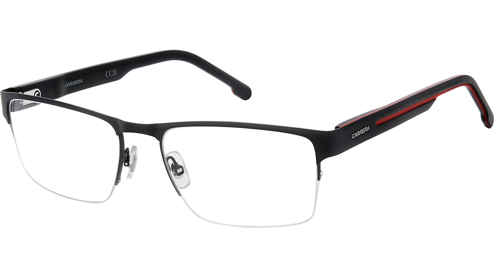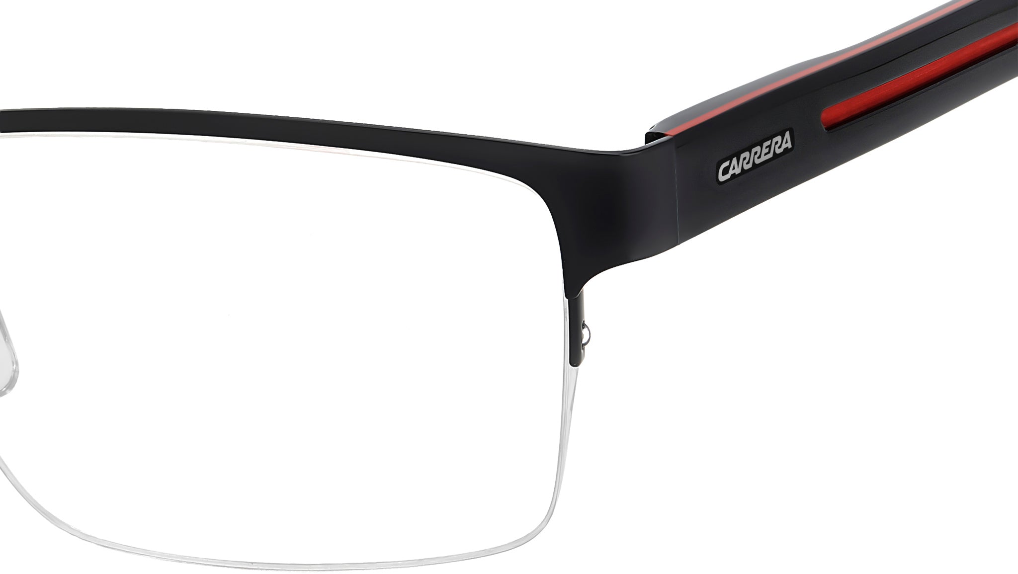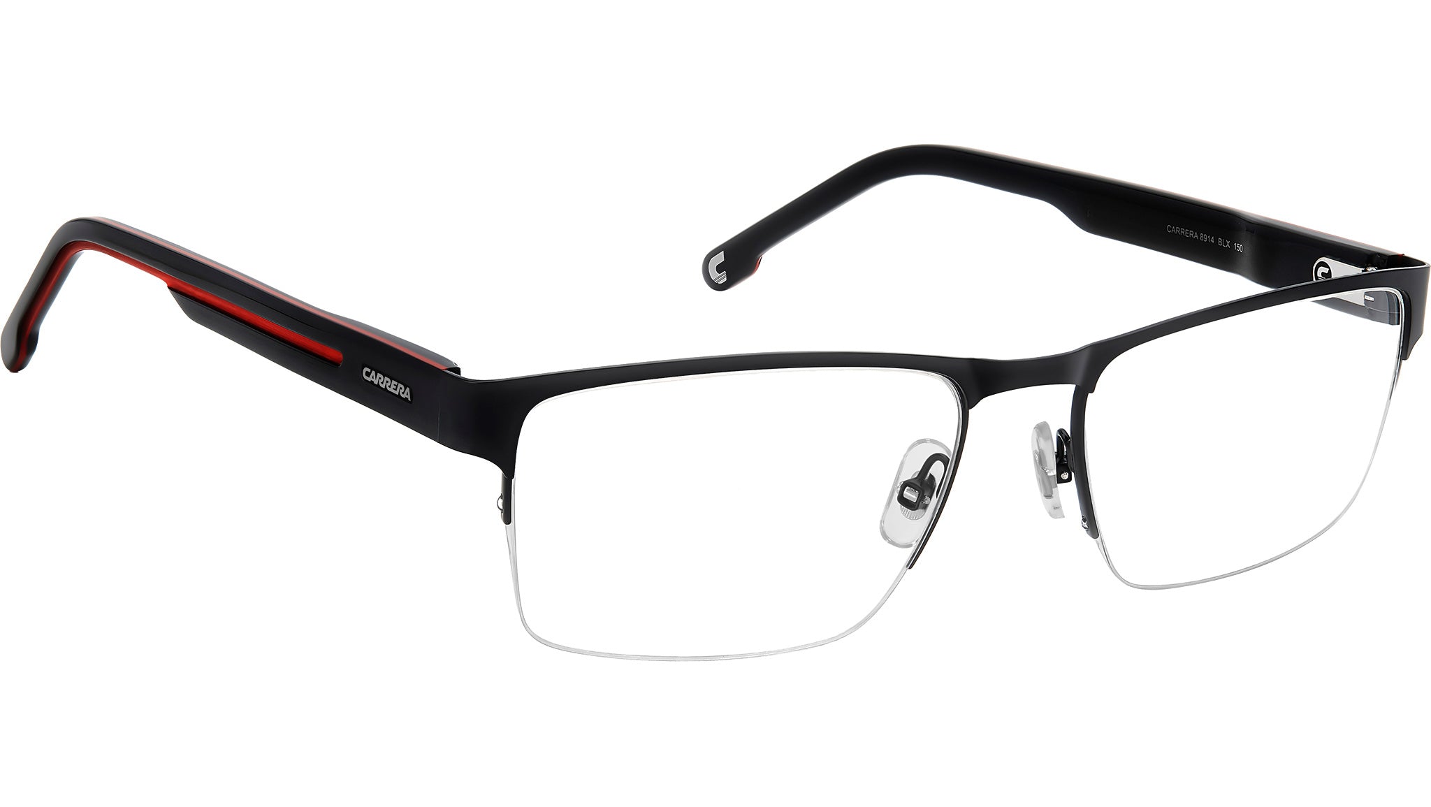 Occhiali da vista Carrera 8914 BLX uomo con montatura rettangolare in metallo nero opaco rosso e lenti demo. Carrera prende molto sul serio il comfort e la versatilità: il risultato è questo occhiale da vista con frontale a mezza montatura. La vestibilità è personalizzata grazie a naselli regolabili, cerniere flessibili e la possibilità di scegliere tra due diversi calibri. Lo stile è definito dalle nuove aste in acetato, scolpite a mimare la flag Carrera. Da scegliere tono su tono, blu, oppure in rosso - colore simbolo Carrera. Linea: Sport. Codice modello: 109536. Codice colore: BLX. Rivenditore autorizzato Carrera online. Gli occhiali vengono consegnati con custodia e accessori originali e sono coperti dalla garanzia ufficiale di 12 mesi del produttore.