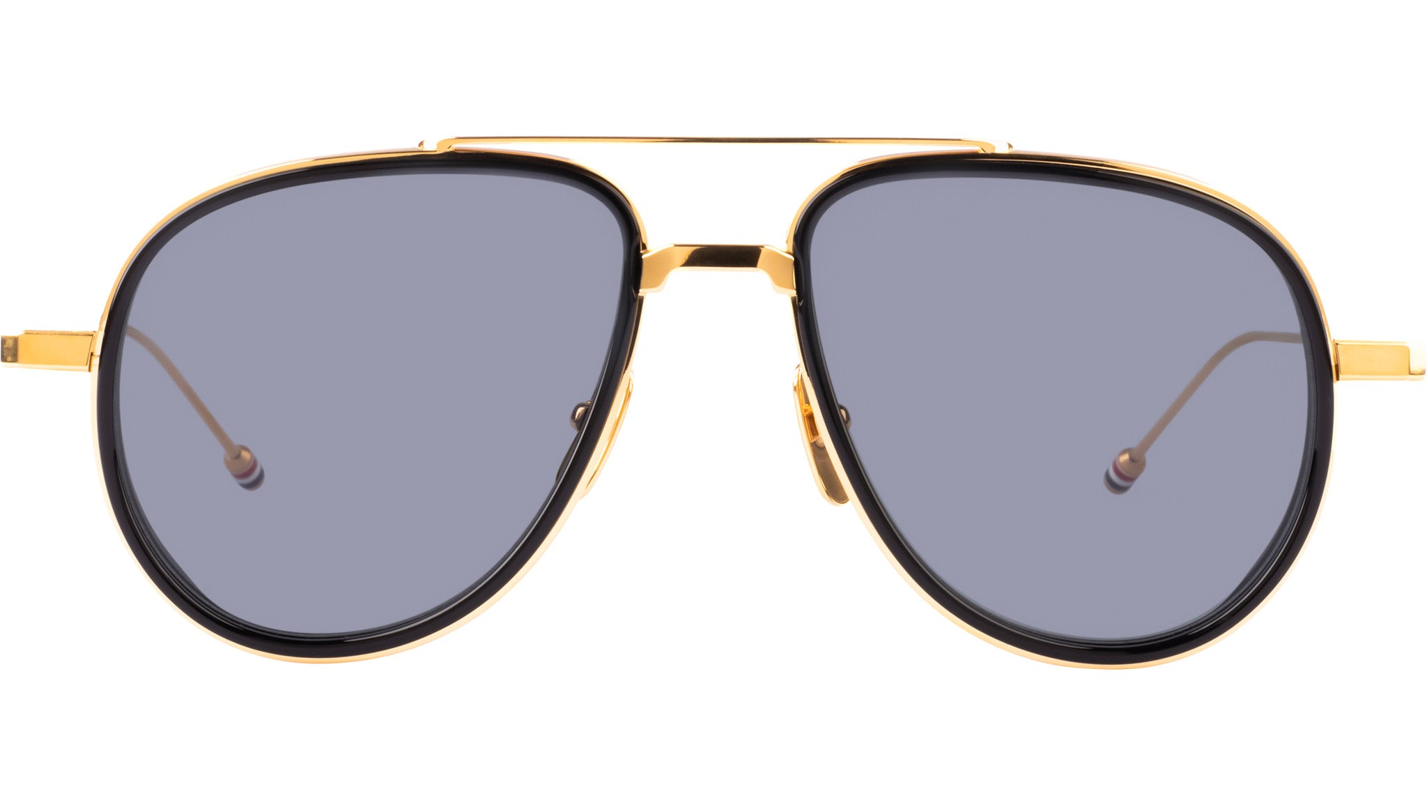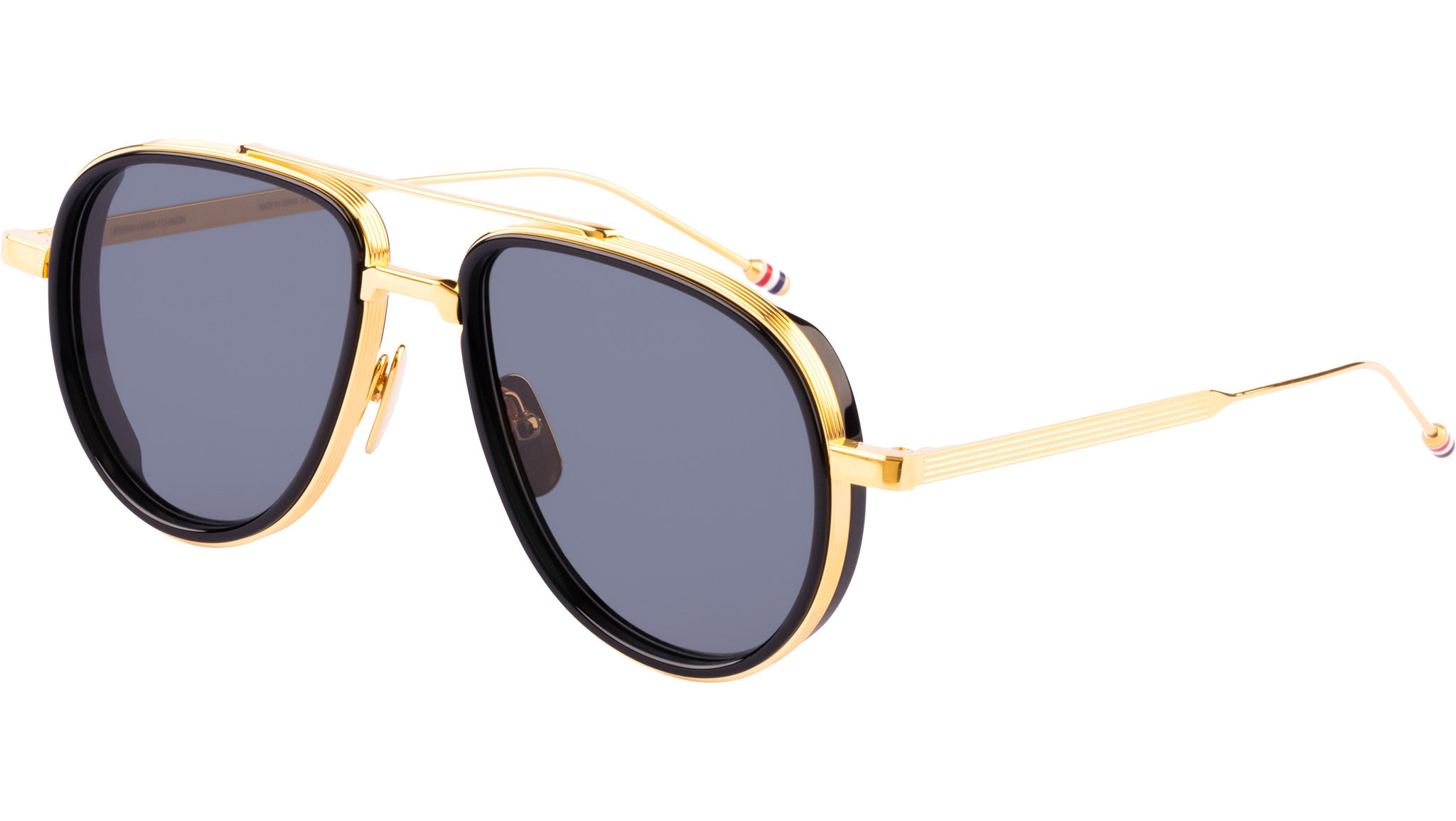 Occhiali da sole Thom Browne unisex modello UES929A con montatura full-rim in titanio nero e oro e lenti color grigio scuro. Forma ovale. Cerniere Signature a 4 barrette. Terminali delle aste smaltati con motivo a righe. Custodia in ecopelle. Made in Japan. Codice Brand: UES929A. Codice colore: 712. Rivenditore autorizzato Thom Browne online. Gli occhiali vengono consegnati con custodia e accessori originali e sono coperti da garanzia standard di 12 mesi del produttore.