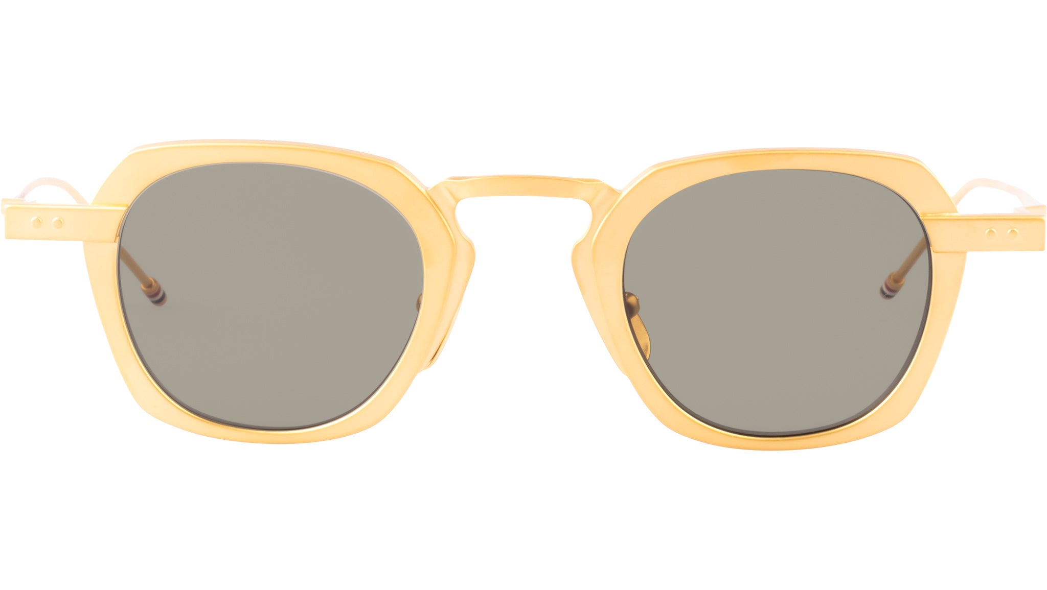 Occhiali da sole Thom Browne unisex modello UES930A con montatura full-rim in titanio placcato oro 18k opaco e lenti color verde G-15. Forma quadrata. Cerniere Signature a 4 barrette. Terminali delle aste smaltati con motivo a righe. Custodia in ecopelle. Made in Japan. Codice Brand: UES930A. Codice colore: 712. Rivenditore autorizzato Thom Browne online. Gli occhiali vengono consegnati con custodia e accessori originali e sono coperti da garanzia standard di 12 mesi del produttore.