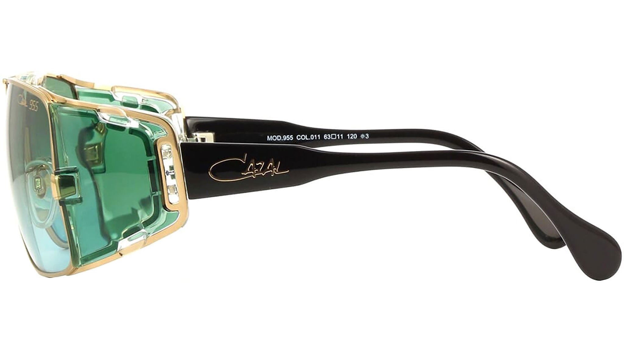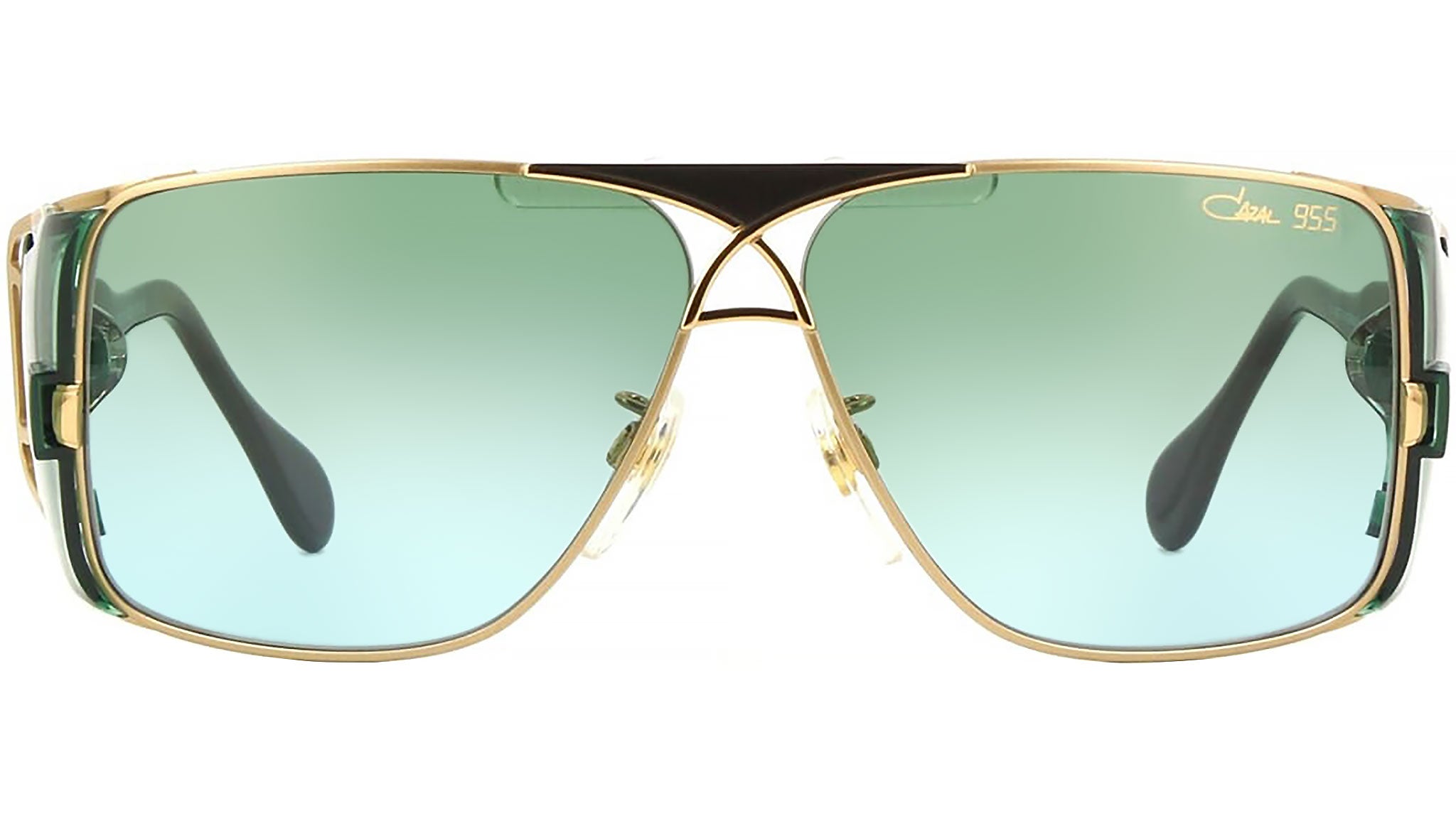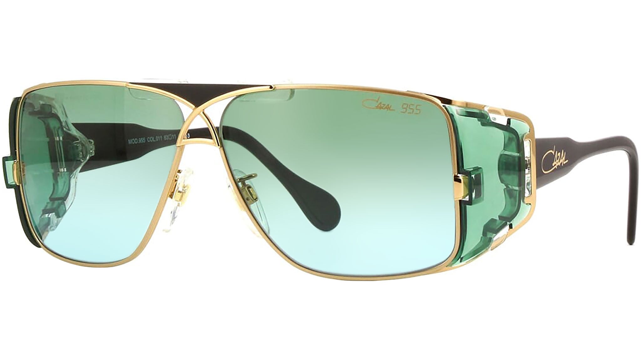 Occhiali da sole Cazal Model 955 011 unisex con montatura rotonda in acciaio oro e lenti sfumato verde. The "955" model features a striking design that builds on the foundation established by the CAZAL "951," originally introduced in 1989. Noteworthy for its appearance on prominent figures such as Mike Reid in the film "Snatch" and John Goodman in "Hangover 3," this eyewear combines style with functionality. The model incorporates the technical specifications of the "951," including a sports strap for added support and acetate temples designed for easy attachment. Codice modello: 955. Codice colore: 011. Rivenditore autorizzato Cazal online. Gli occhiali vengono consegnati con custodia e accessori originali e sono coperti dalla garanzia ufficiale di 12 mesi del produttore.