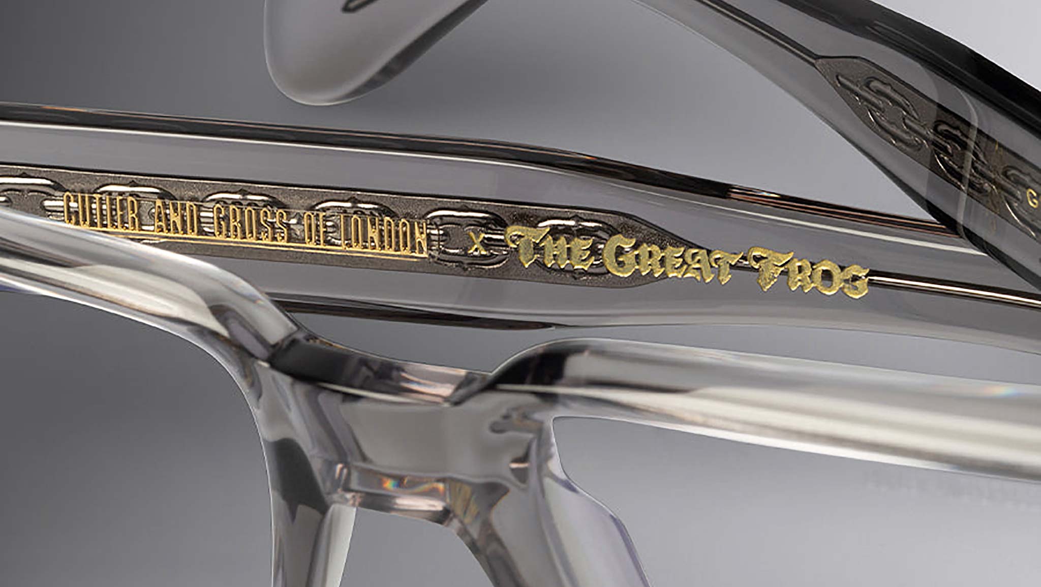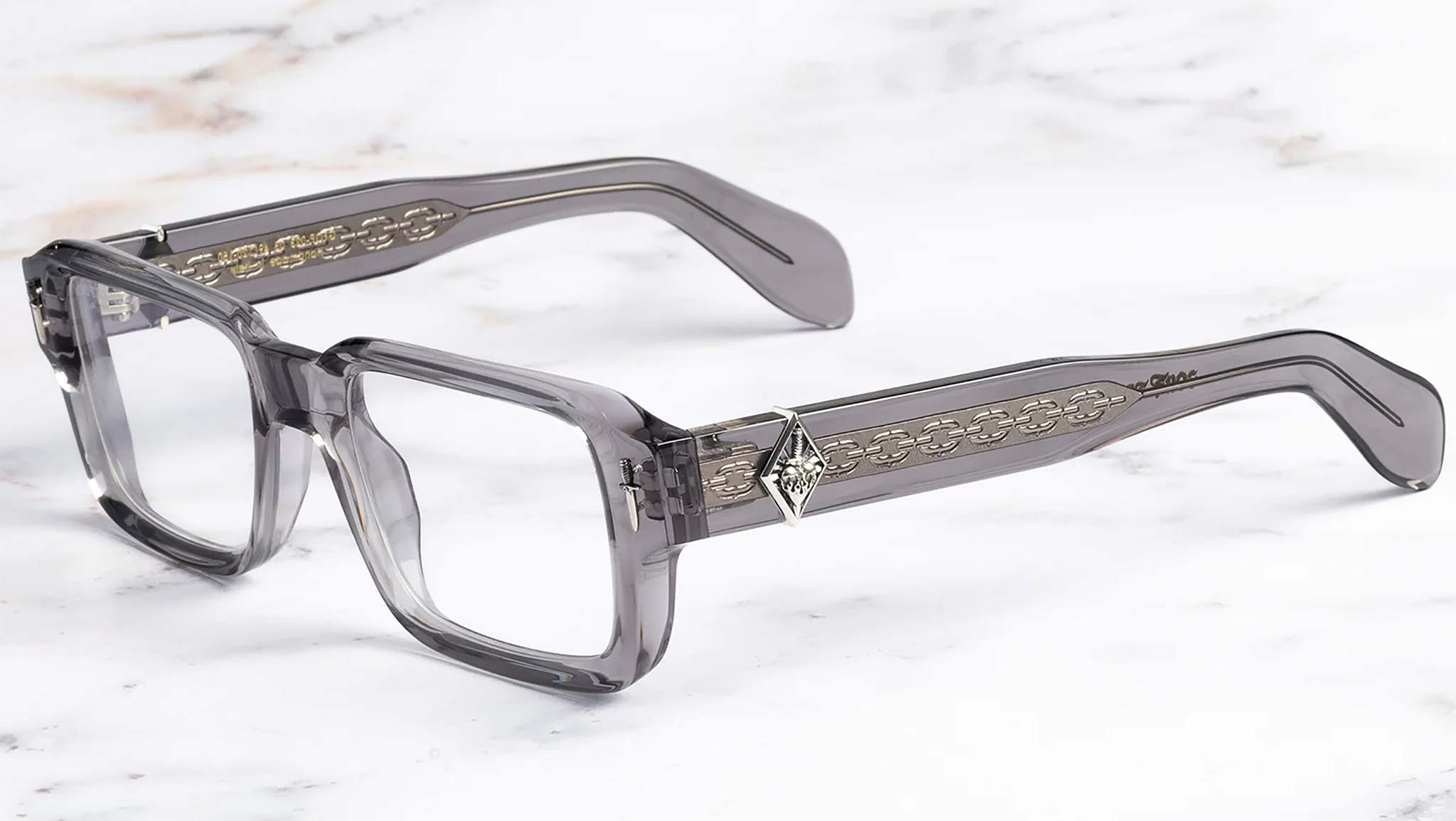 Prodotti in una tiratura limitata di soli 350 pezzi, i Jagger Rectangle Opticals firmati Cutler and Gross rileggono la silhouette squadrata attraverso l’estetica audace e sovversiva di The Great Frog. Realizzata a mano in Italia, la montatura presenta perni anteriori a forma di pugnale in argento sterling e simboli Flaming Heart sulle aste, espressione dello spirito ribelle della collezione. Le smussature scolpite valorizzano la struttura, mentre le aste a forma di plettro e l’anima interna Lock Down Chain conferiscono solidità e carattere distintivo. Il logo in lamina dorata all’interno delle aste sigla un design che celebra artigianalità e stile provocatorio.