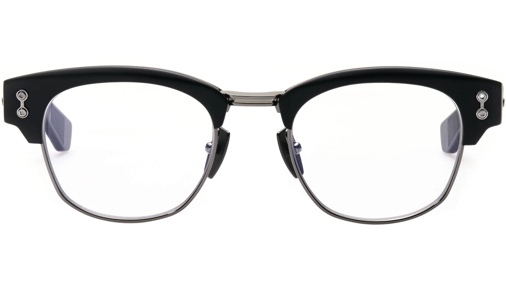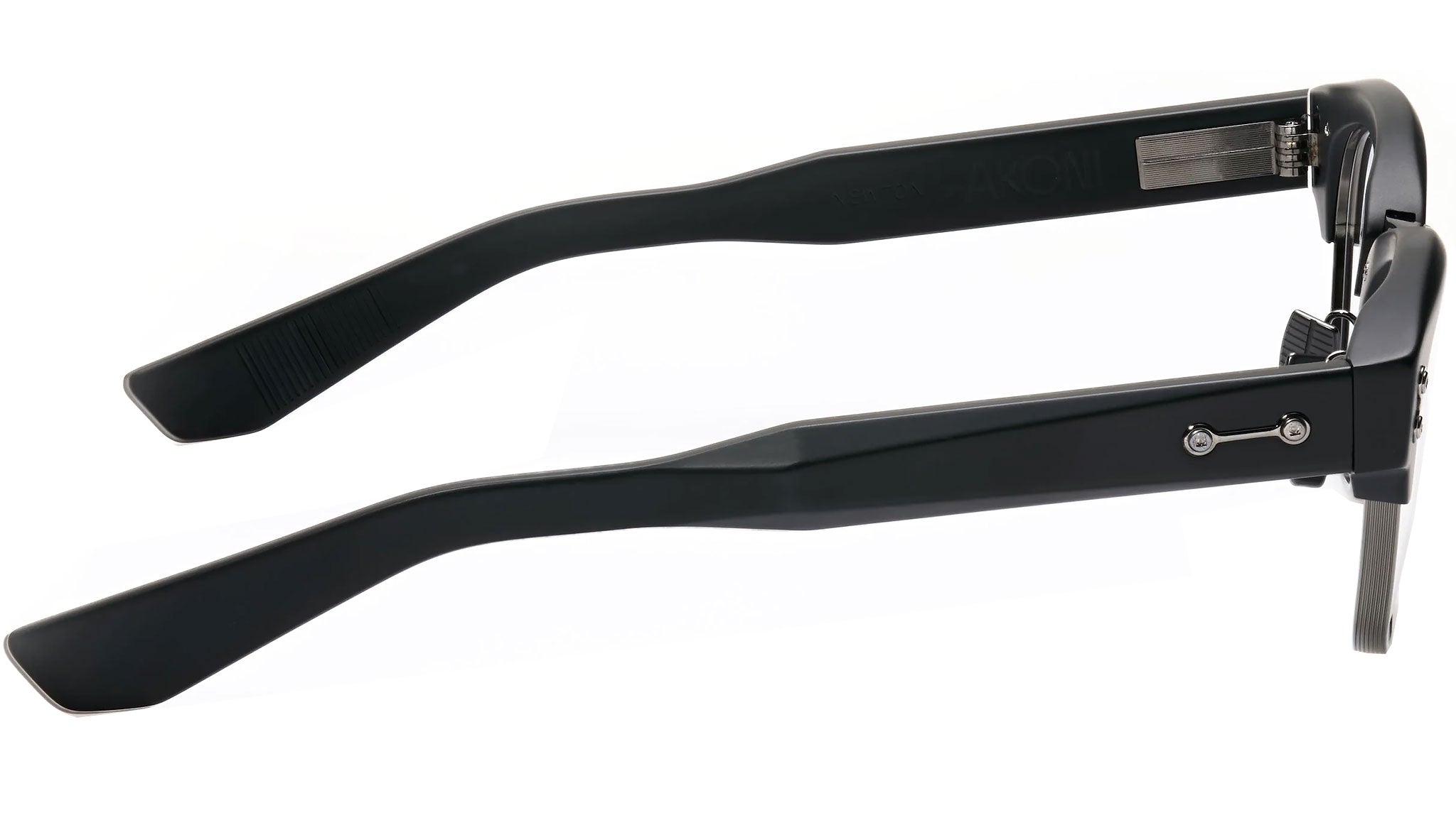 Newton propone una versione decisa della silhouette Clubmaster, con un mix di tradizione e carattere moderno. Parte della Collection VIII, si distingue per i cerchi in titanio più spessi del consueto e per aste scolpite in acetato, che definiscono un profilo marcato e architettonico. La finitura nero opaco e rodio nero valorizza ogni dettaglio, comprese le lavorazioni incise su titanio e anima in acetato. Il doppio ponte parallelo in titanio richiama il design Copernico di Akoni, mentre le aste laminate con anima metallica a vista aggiungono struttura e impatto visivo. Prodotto a mano in Giappone e accompagnato da custodia rigida, panno in microfibra e certificato di autenticità.