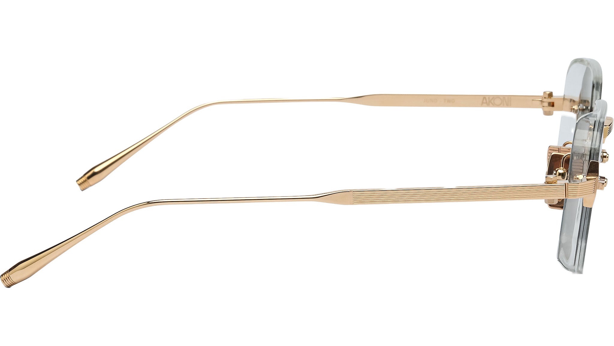 Realizzato con precisione svizzera e maestria giapponese, Juno-Two unisce design geometrico e raffinatezza in una silhouette audace e distintiva. Ispirato a un grande asteroide, combina elementi circolari e squadrati in un profilo unico a metà tra montatura piena e senza cerchio, valorizzato da bordi sottili in acetato e lenti in nylon Deep Emerald Green dal gusto rétro anni '90. Il contrasto tra l’acetato trasparente e il titanio oro 12k evidenzia la cura per i dettagli e l’artigianalità tipica di Akoni. Il design richiama la precisione degli orologi di lusso e degli strumenti di alta gamma. Prodotto in Giappone e fornito con custodia rigida personalizzata, panno in microfibra e certificato di autenticità.
