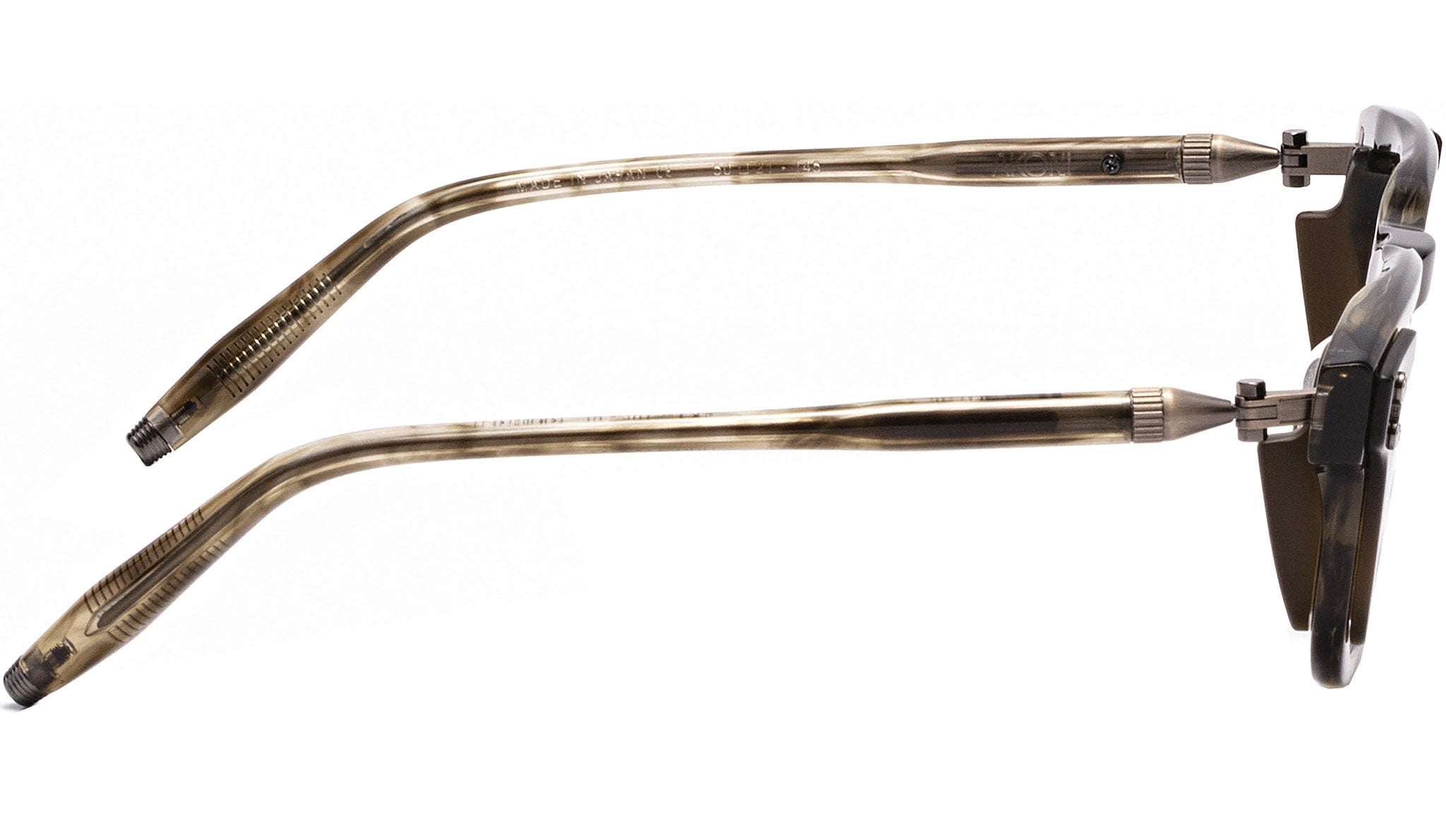 Orion evolve lo spirito ribelle e intellettuale del modello Gemini con una silhouette arrotondata arricchita da dettagli ricercati e lavorazioni innovative. Realizzata in pregiato acetato giapponese con pattern swirl tartarugato verde, protezioni laterali color oliva e finiture in oro bianco anticato opaco, la montatura valorizza l’accostamento di toni attraverso il preciso posizionamento delle protezioni. Le incisioni sulle aste, ispirate alle corone degli orologi di lusso, sono realizzate per la prima volta in acetato, a conferma della volontà di Akoni di portare l’estetica degli accessori di alta gamma nell’eyewear. Il design, che unisce stile classico e sensibilità moderna, accoglie con discrezione anche lenti graduate di spessore elevato. Prodotto a mano in Giappone e fornito con custodia rigida, panno in microfibra e certificato di autenticità.