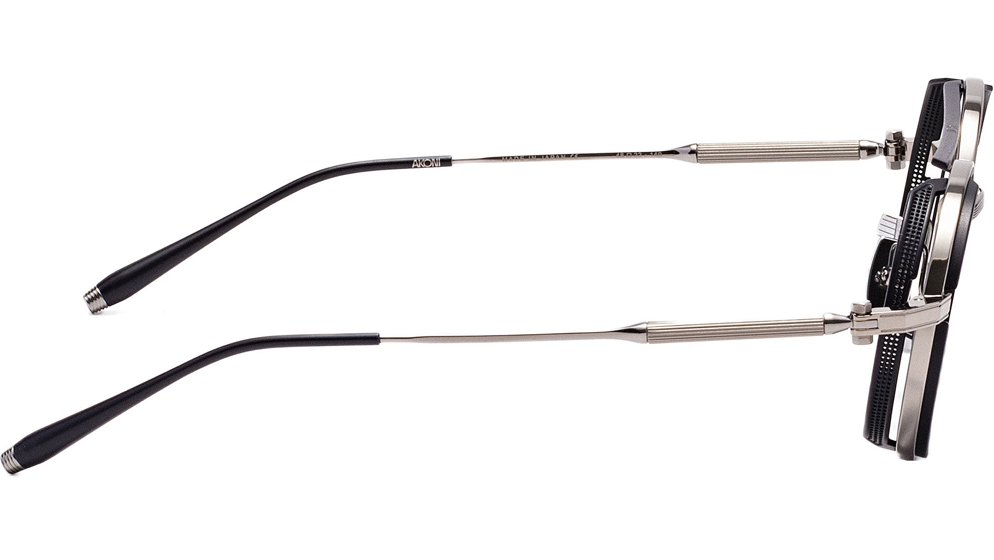 Eris si ispira alla tecnica poetica della ripetizione, resa visivamente attraverso una doppia struttura in titanio perfettamente coassiale che esalta l’effetto stratificato. Il titanio giapponese ultra-leggero e resistente dà forma a una montatura arricchita da protezioni laterali con motivo circolare, richiamo diretto al logo Akoni. La finitura in palladio nero e navy opaco si abbina a lenti CR-39 grigio scuro con specchiatura argento e trattamento antiriflesso, unendo estetica e funzionalità. Prodotta artigianalmente in Giappone, viene consegnata con custodia rigida, panno in microfibra e certificato di autenticità.