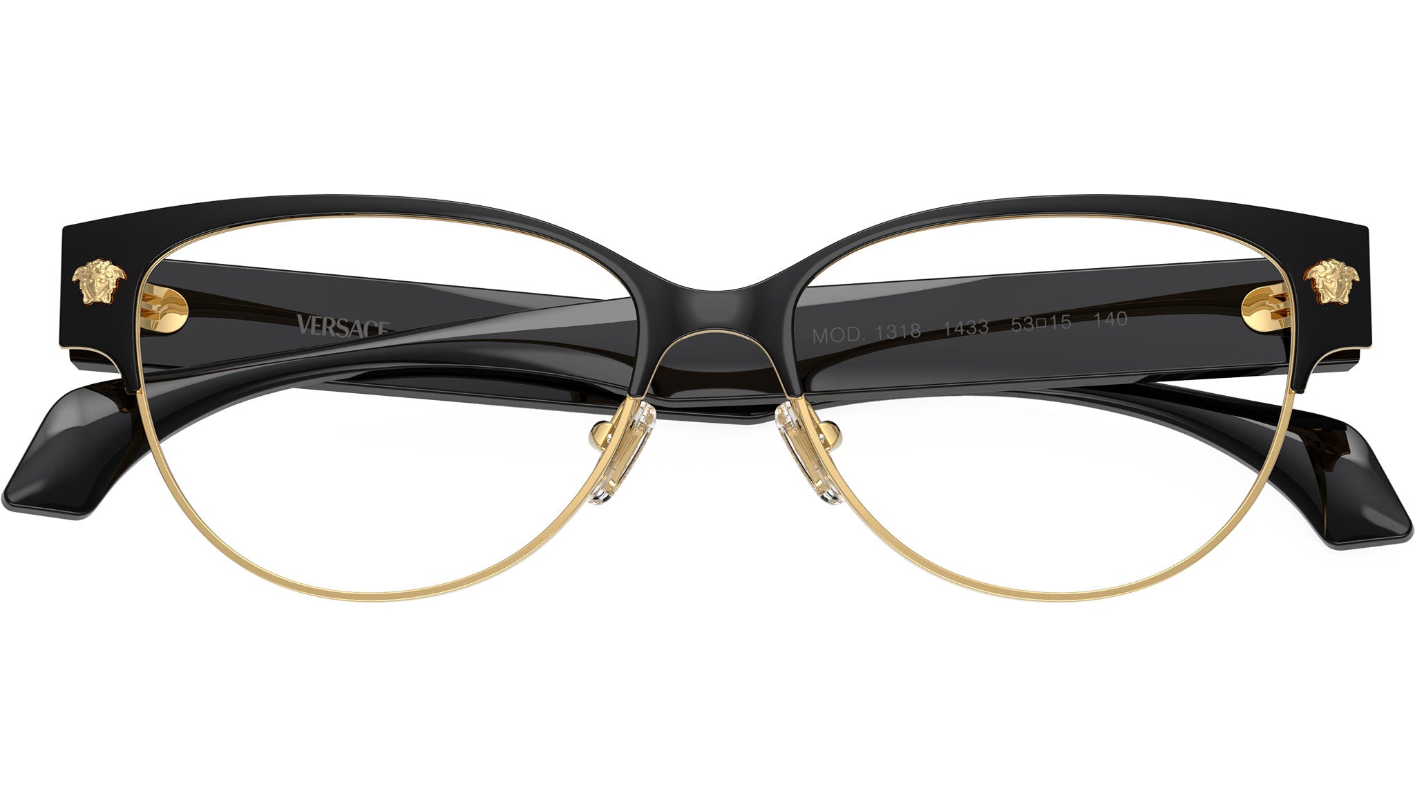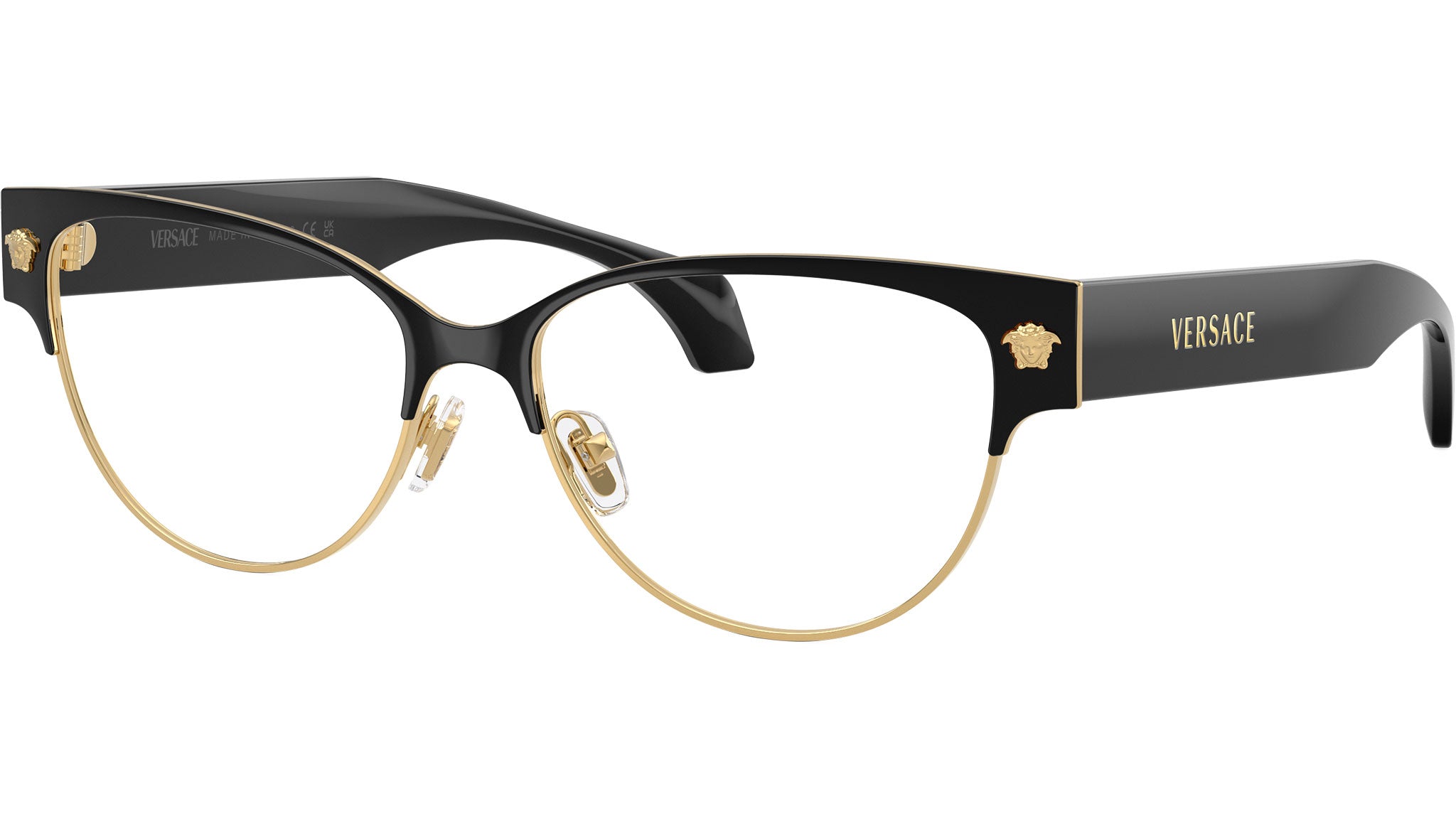 Montatura per occhiali da vista Versace donna modello VE1318 1433 con montatura cat eye in metallo nero / oro e lenti demo base 4. Naselli regolabili. Linea: Daily Heritage. Codice Brand: 0VE1318. Codice colore: 1433. Rivenditore autorizzato online Versace Eyewear. Ogni prodotto Versace viene consegnato con astuccio originale e accessori ed è coperto da garanzia del produttore di 12 mesi.