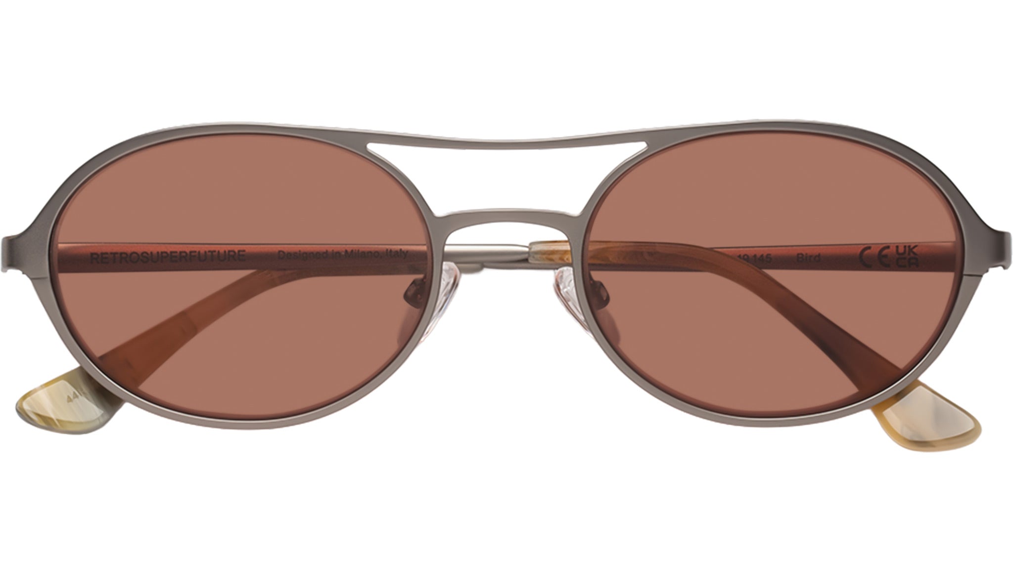 Occhiali da sole Retrosuperfuture Bird Boogie con montatura in acetato argento scuro e lenti color rosa. Codice modello: 44R. Made in Italy. Rivenditore autorizzato RSF online. Gli occhiali vengono consegnati con custodia e accessori originali e sono coperti dalla garanzia ufficiale di 12 mesi del produttore.