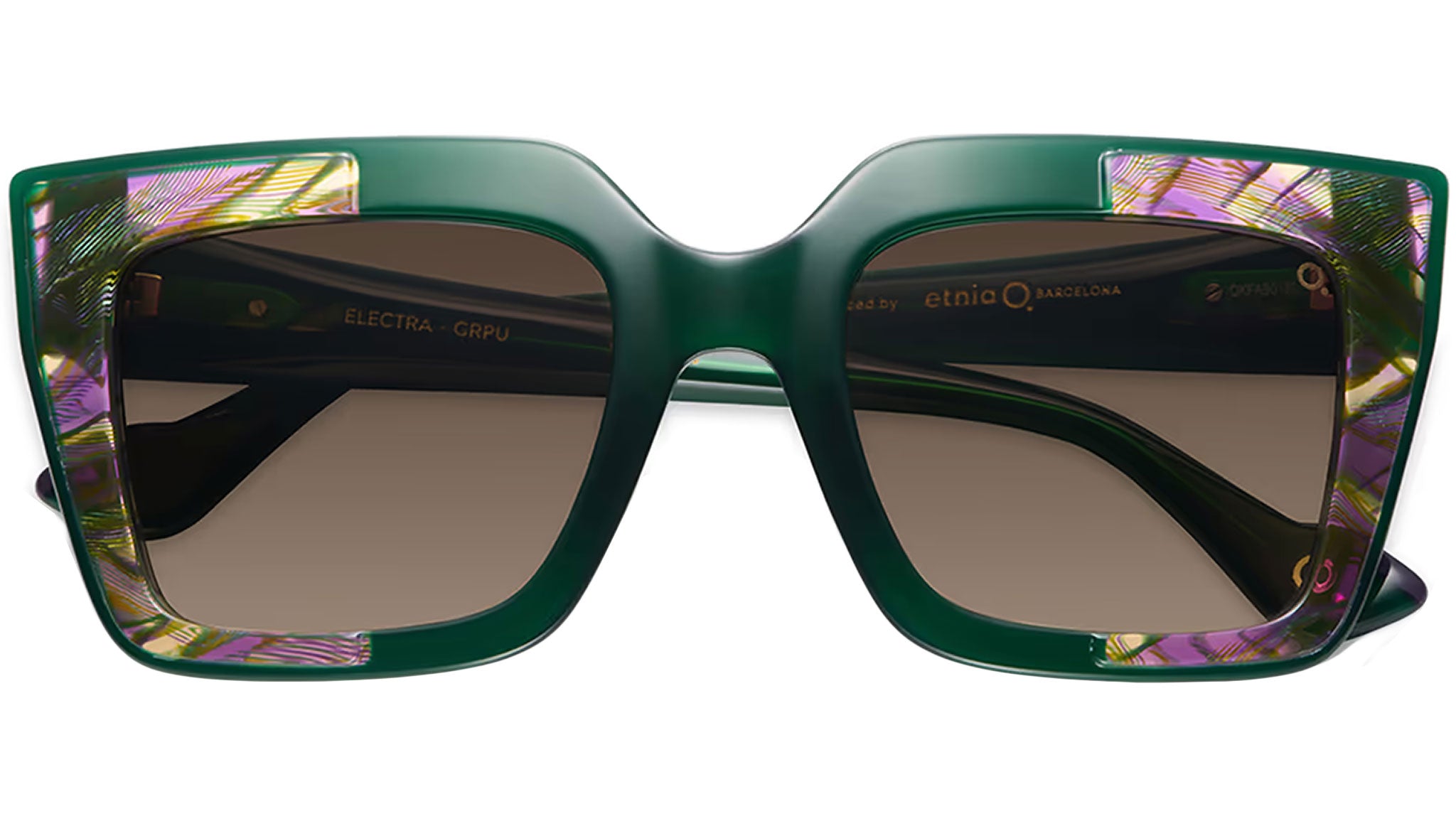 Occhiali da sole Etnia Barcelona ELECTRA in acetato verde e viola con lenti color marrone HD fotocromatico. Codice modello: ELECTRA 52S. Codice colore: GRPU. Rivenditore autorizzato online Etnia Barcelona. Gli occhiali vengono forniti con custodia e accessori originali e sono coperti dalla garanzia standard del produttore di 12 mesi.