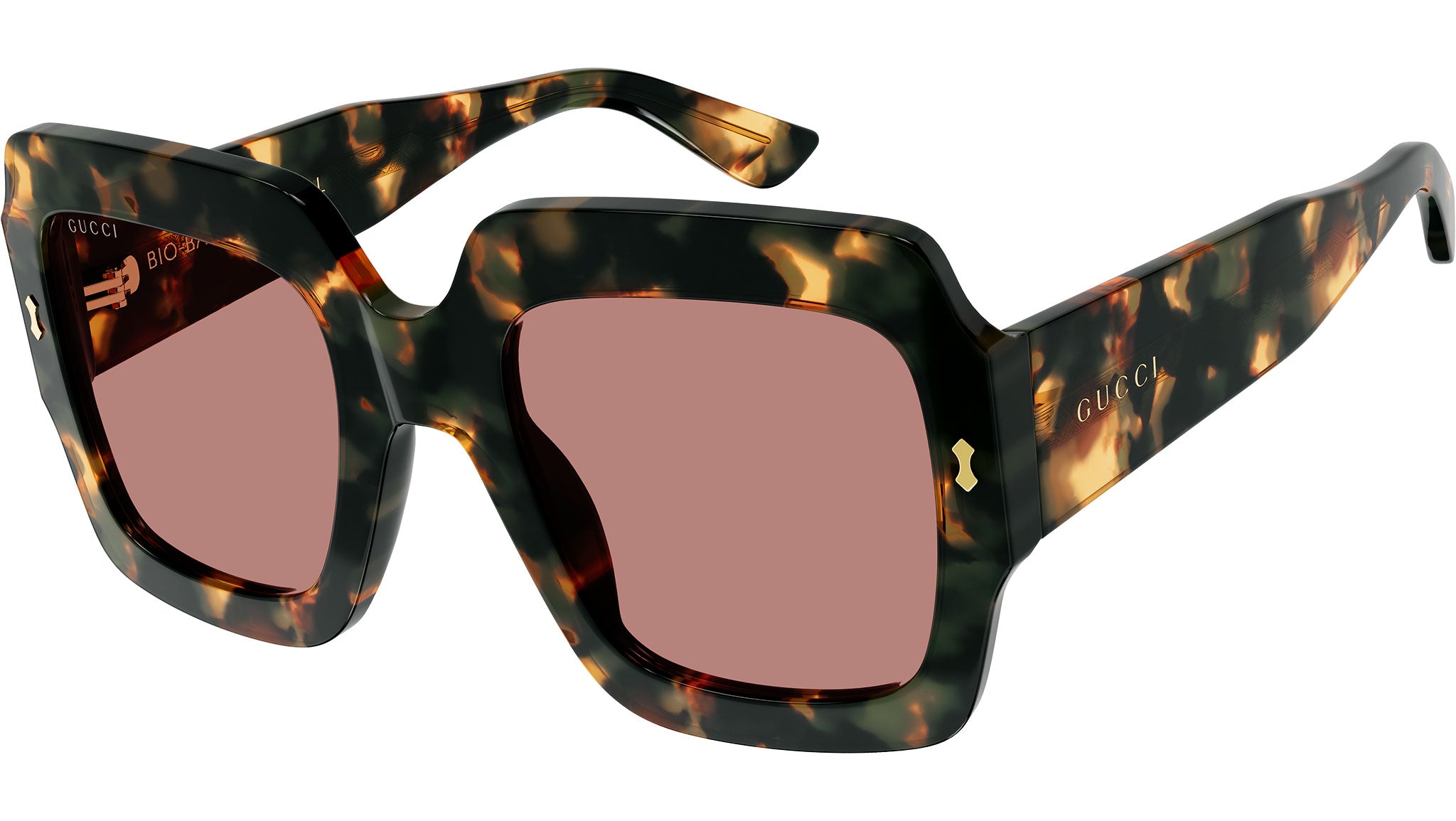 Occhiali da sole Gucci linea Gucci Logo modello GG1111S variante colore 003 avana verde lucido con lenti color tartaruga.