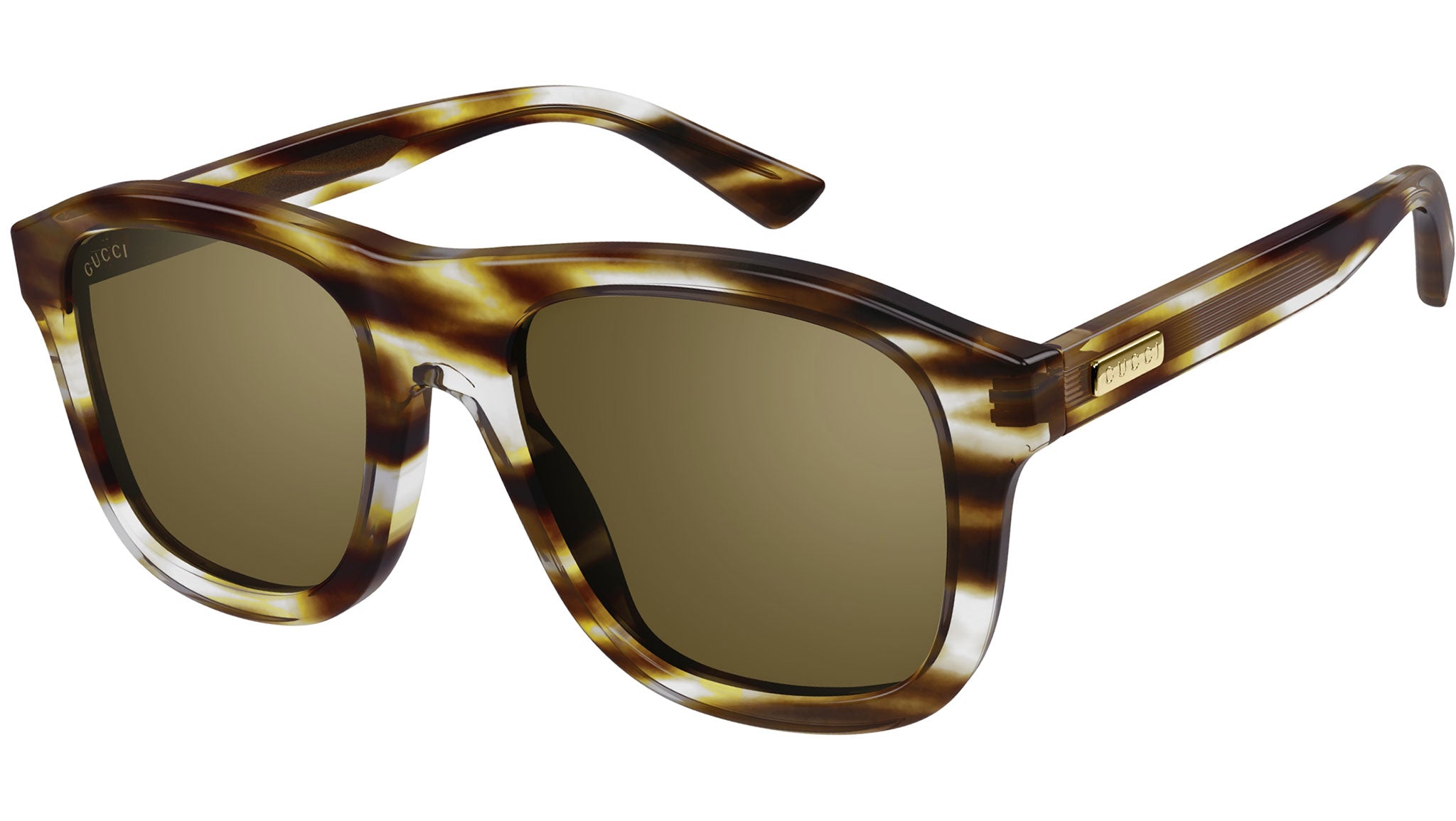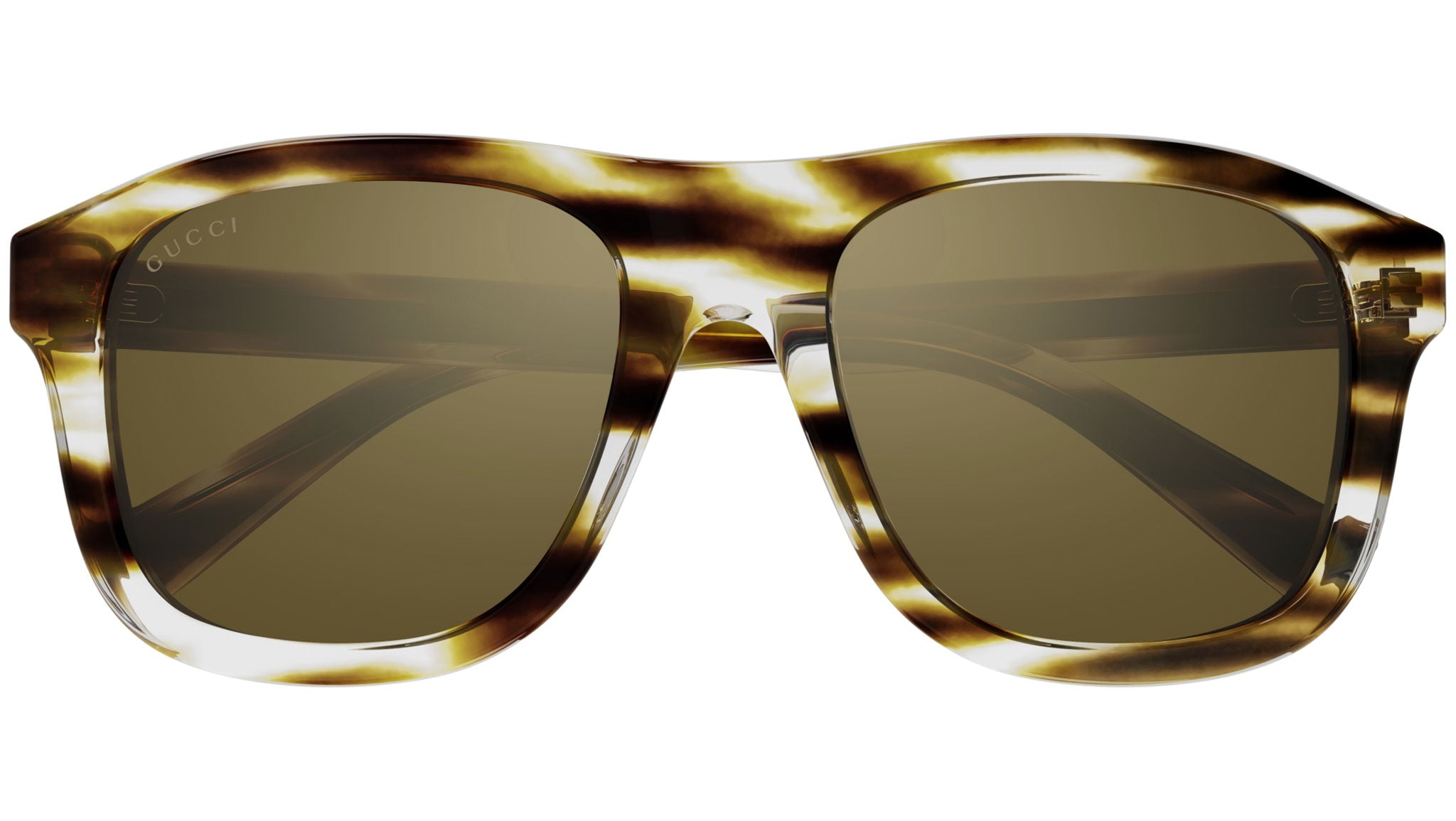 Occhiali da sole Gucci linea modello GG1316S variante colore 003 avana striato verde lucido con lenti color tartaruga.
