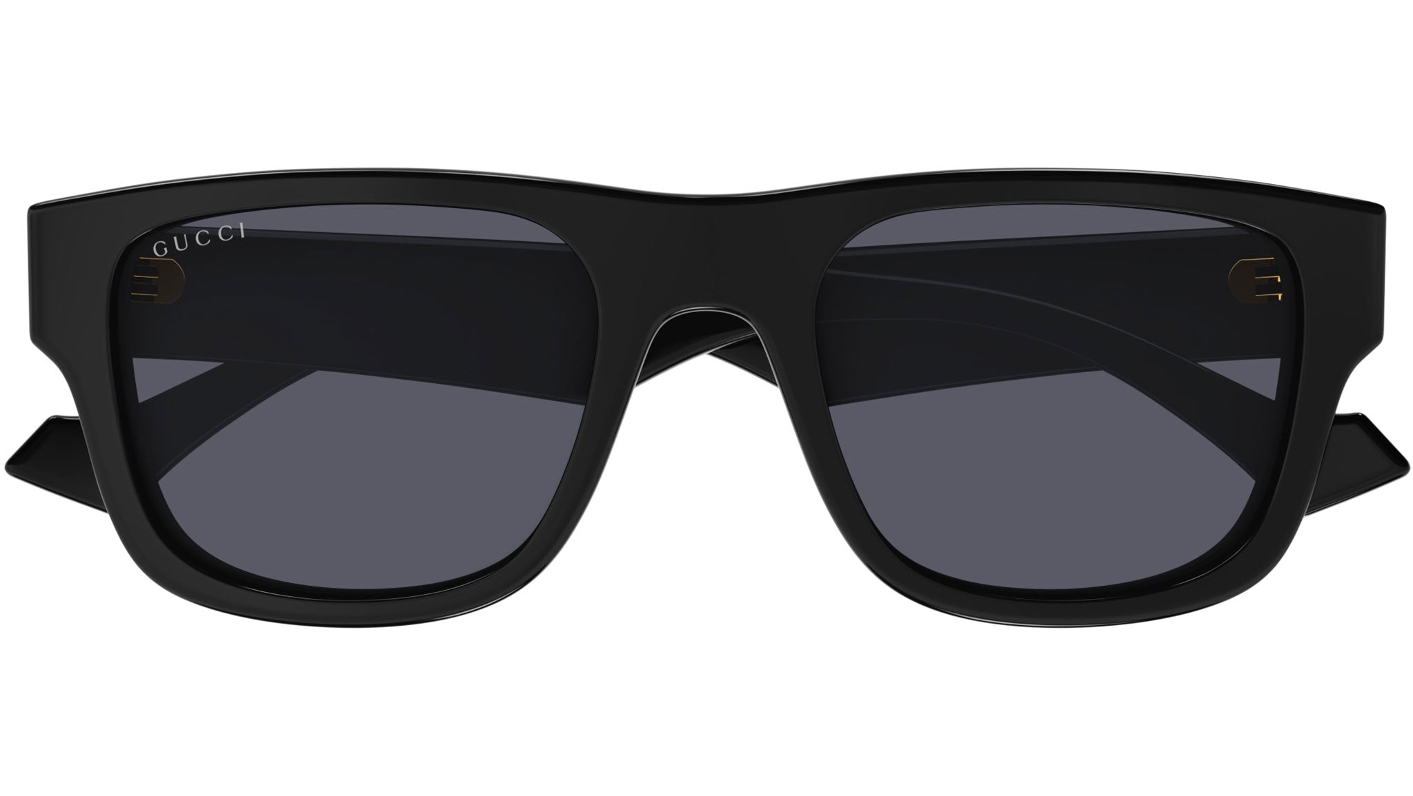 Occhiali da sole Gucci linea Lettering modello GG1427S 001 in acetato riciclato nero lucido tinta unita con aste color nero e lenti grigio tinta unita.