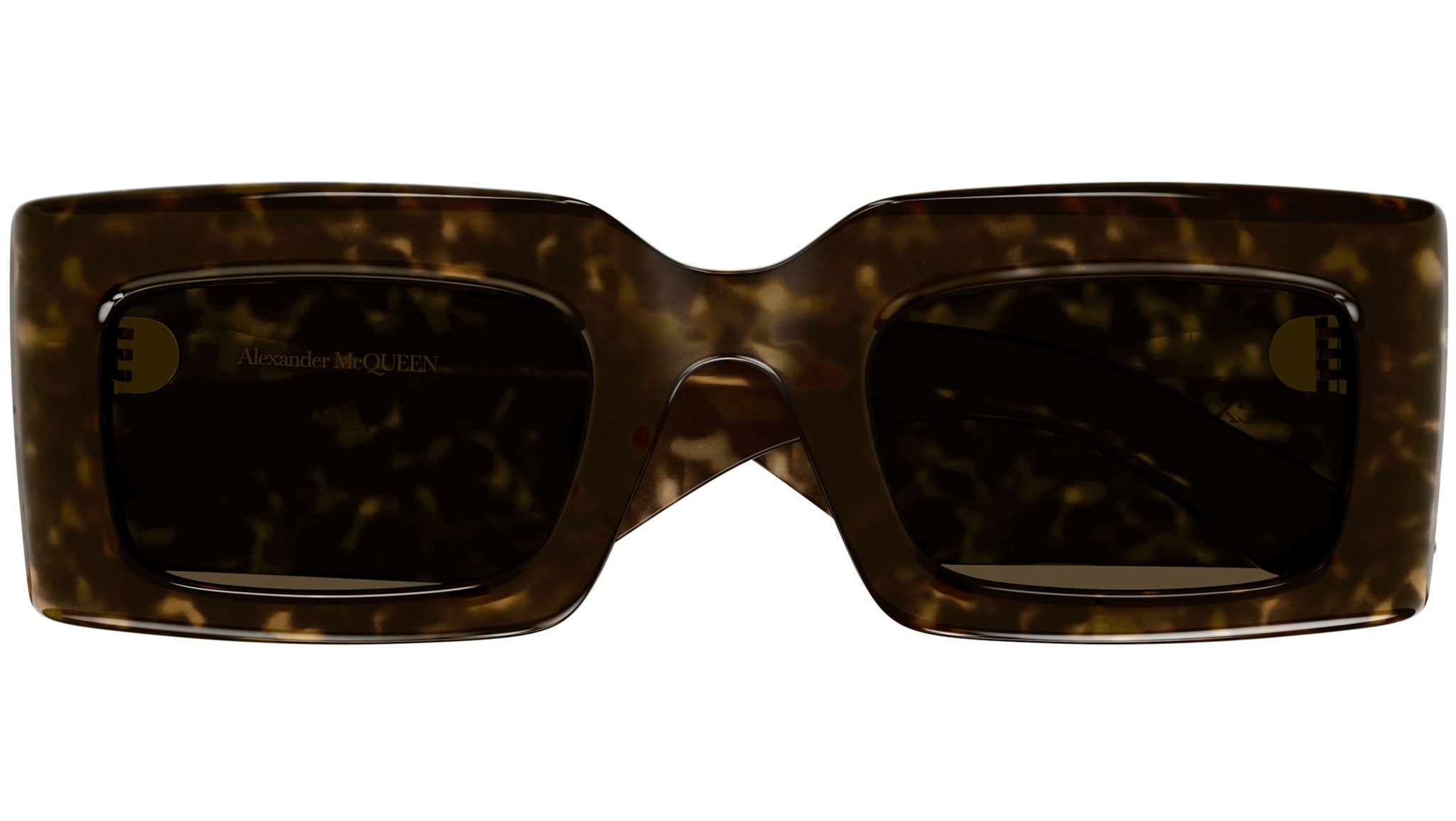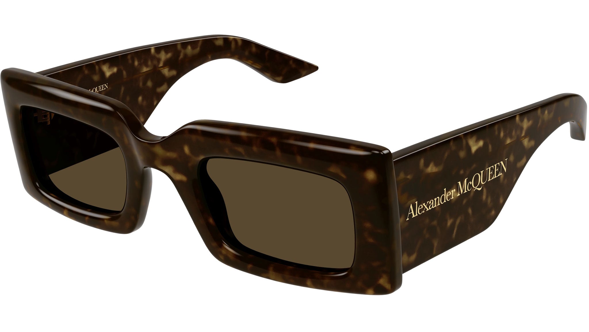 Occhiali da sole Alexander McQueen Casual Lines modello AM0433S rectangle in acetato riciclato codice colore 002 tartaruga scuro lucido con aste tartaruga e lenti color marrone tinta unita.