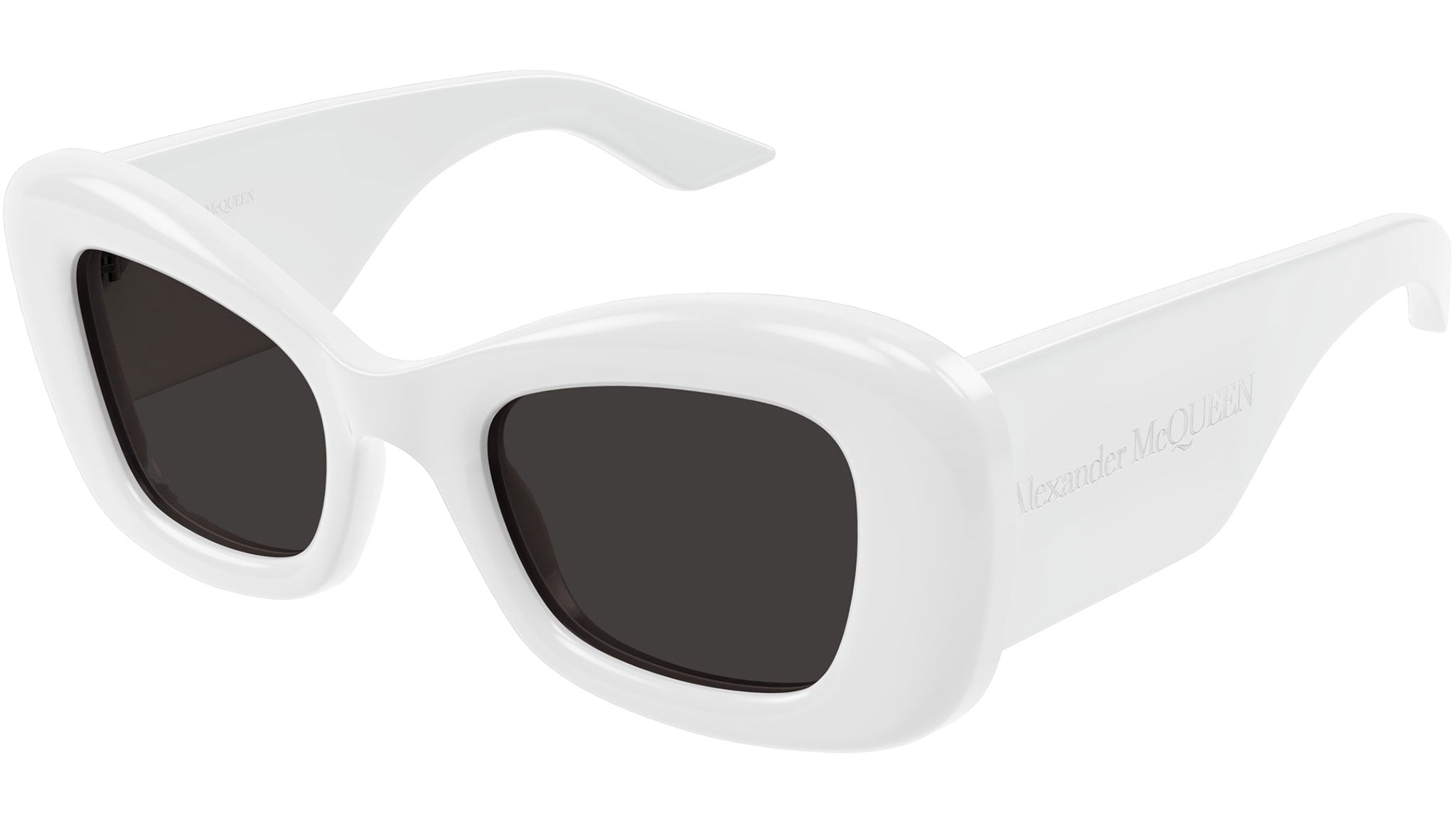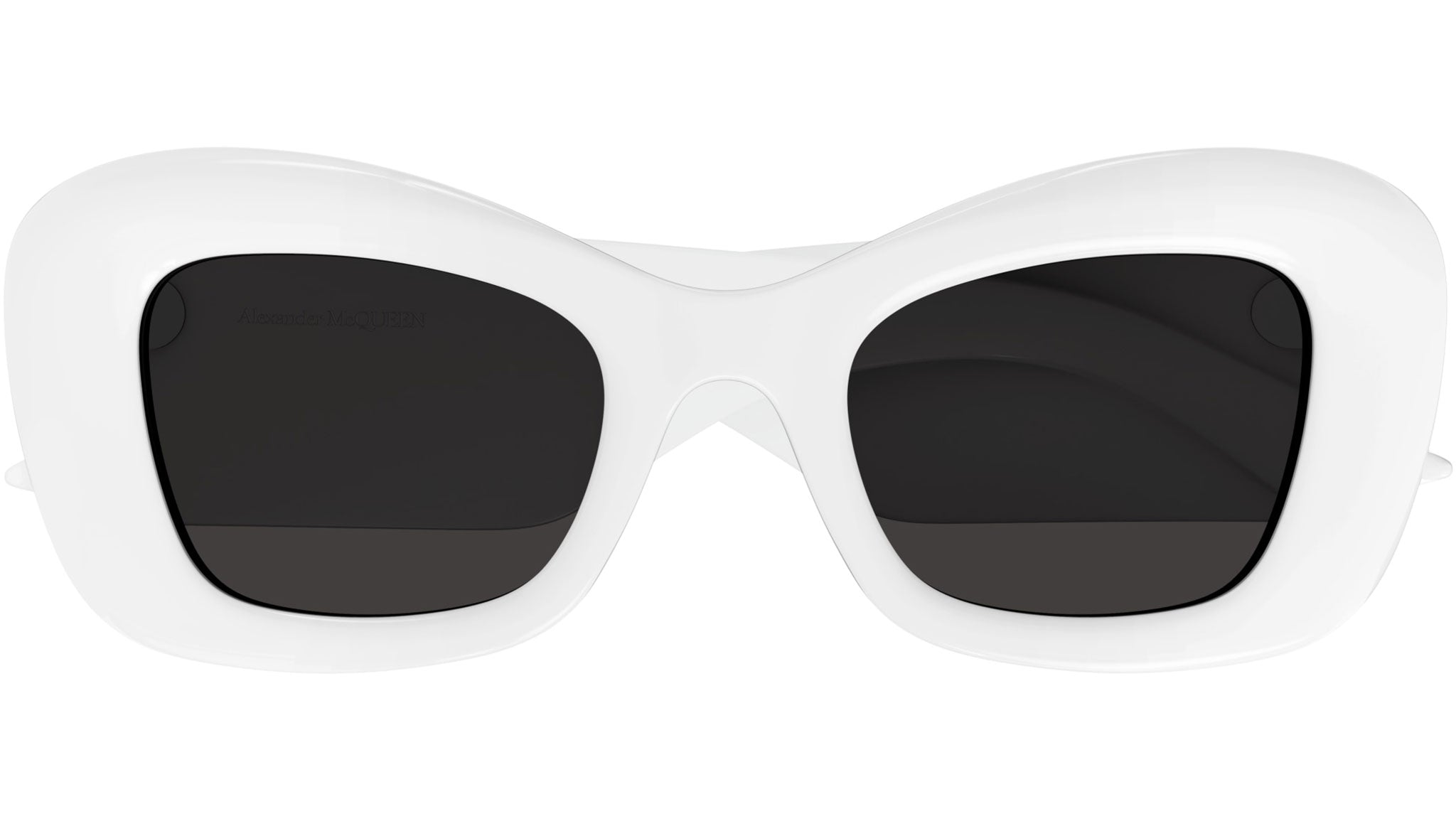 Occhiali da sole Alexander McQueen Casual Lines modello AM0434S cat eye in acetato riciclato codice colore 005 bianco tinta unita lucido con aste bianco e lenti color grigio tinta unita.