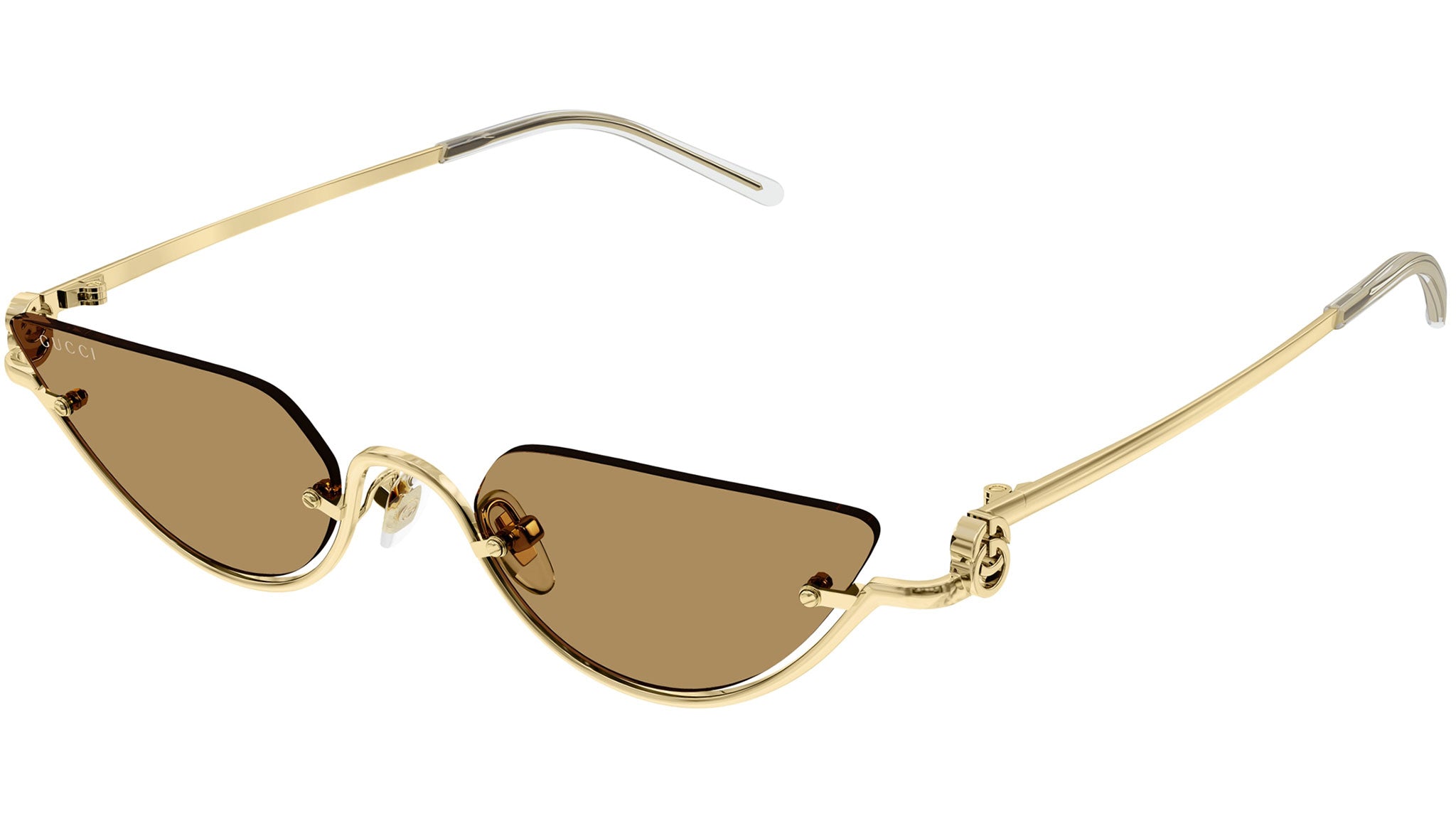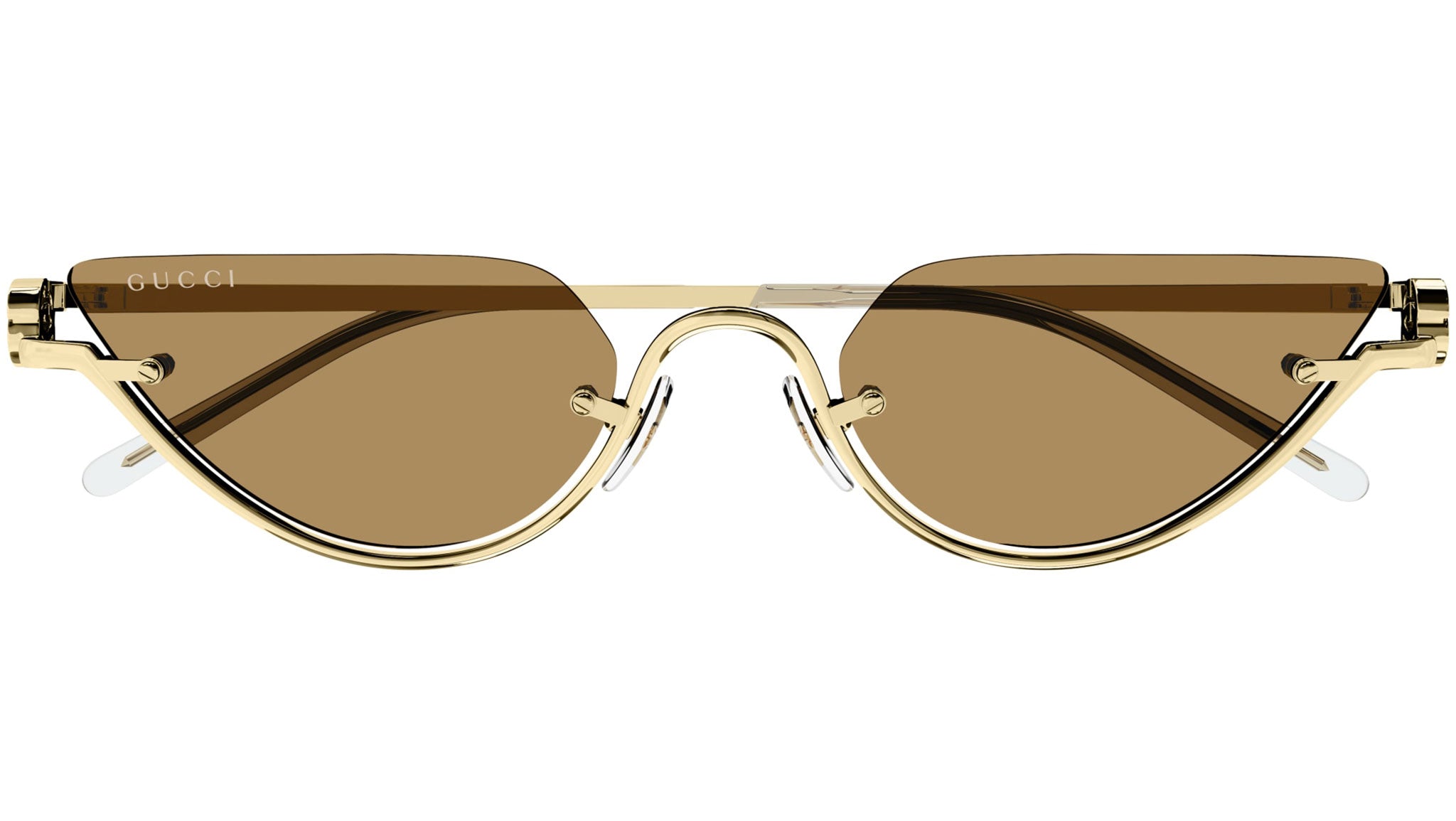 Occhiali da sole Gucci linea GG Logo modello GG1603S cat eye in metallo codice colore 002 oro endura lucido con aste oro e lenti color marrone tinta unita.