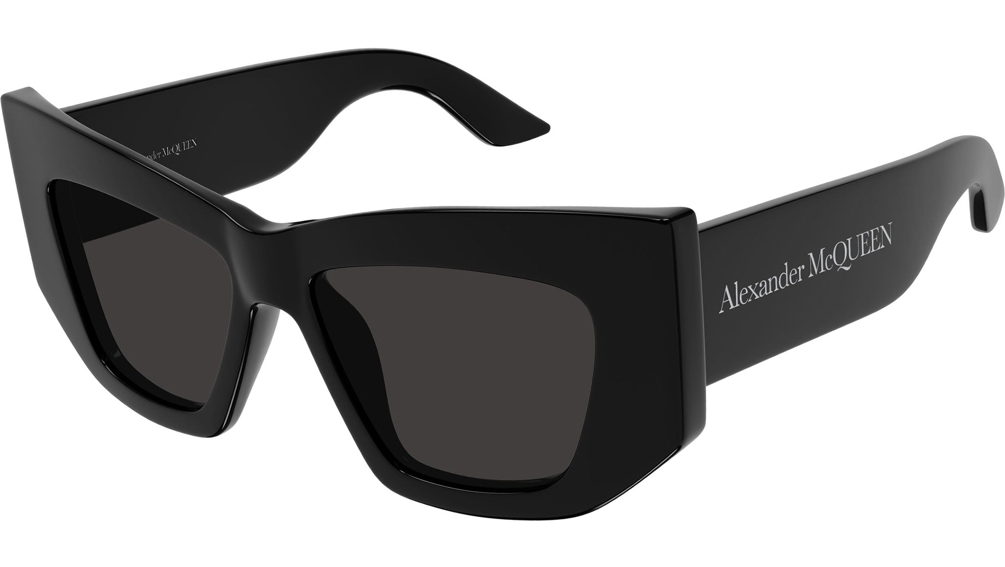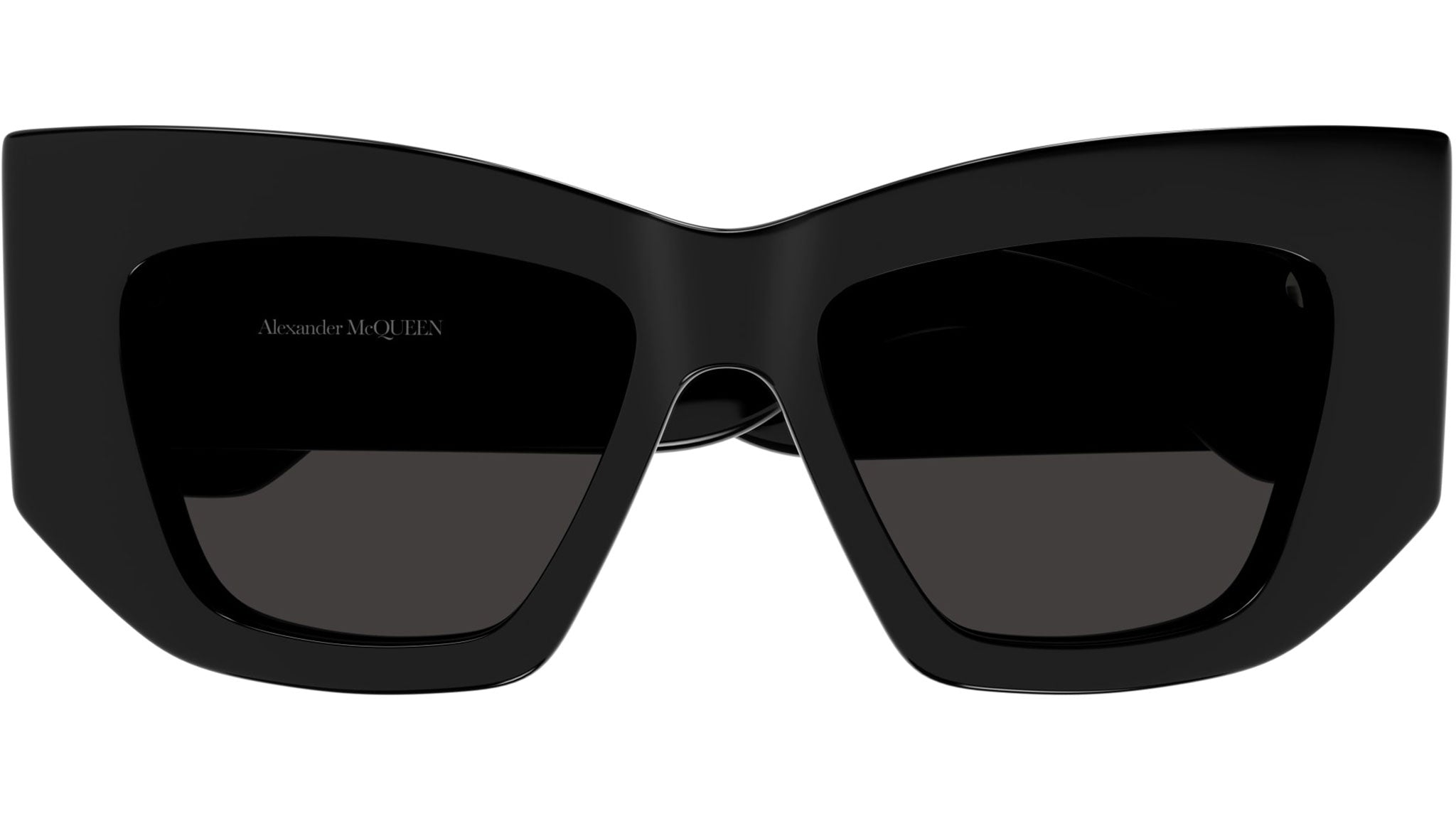 Occhiali da sole Alexander McQueen Casual Lines modello AM0448S cat eye in acetato riciclato codice colore 001 nero lucido tinta unita con aste nero e lenti color grigio tinta unita.