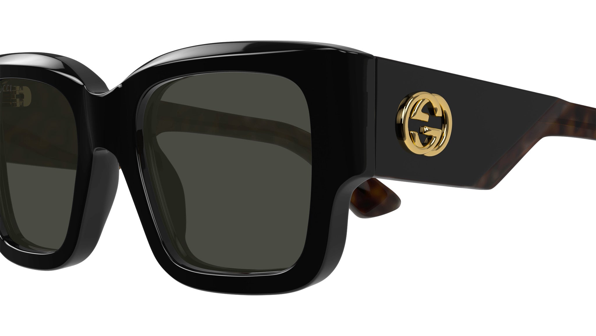 Occhiali da sole Gucci modello GG1663S linea GG Logo in acetato riciclato forma rettangolare codice colore 001 nero lucido con aste tartaruga e lenti grigio tinta unita. Rivenditore autorizzato Gucci online. Gli occhiali vengono consegnati con custodia e accessori originali e sono coperti dalla garanzia ufficiale di 12 mesi del produttore.