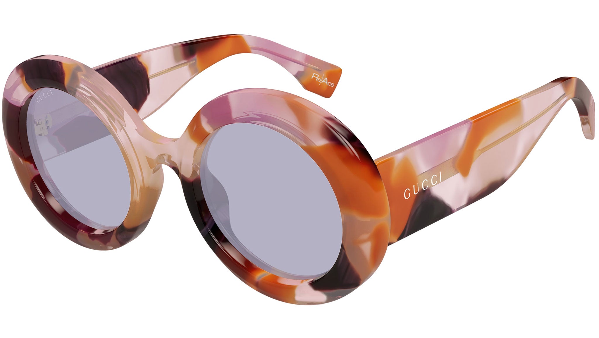Occhiali da sole Gucci modello GG1748S linea Lettering in acetato riciclato forma pantos codice colore 003 maculato organico viola trasparente e avana rosa torbido con aste viola e lenti viola solido vivido. Rivenditore autorizzato Gucci online. Gli occhiali vengono consegnati con custodia e accessori originali e sono coperti dalla garanzia ufficiale di 12 mesi del produttore.