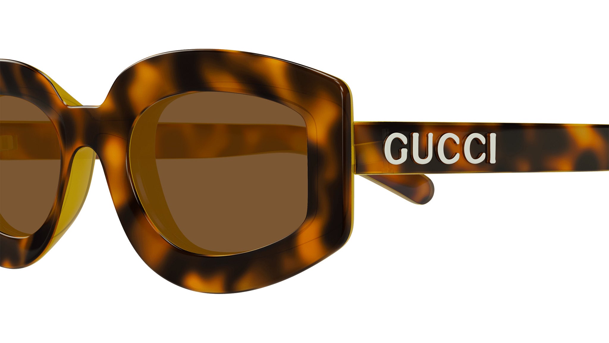 Occhiali da sole Gucci modello GG1719S linea Lettering in iniettato forma geometrica codice colore 002 avana maculato lucido + giallo con aste tartaruga e lenti beige nicotine tinta unita. Rivenditore autorizzato Gucci online. Gli occhiali vengono consegnati con custodia e accessori originali e sono coperti dalla garanzia ufficiale di 12 mesi del produttore.