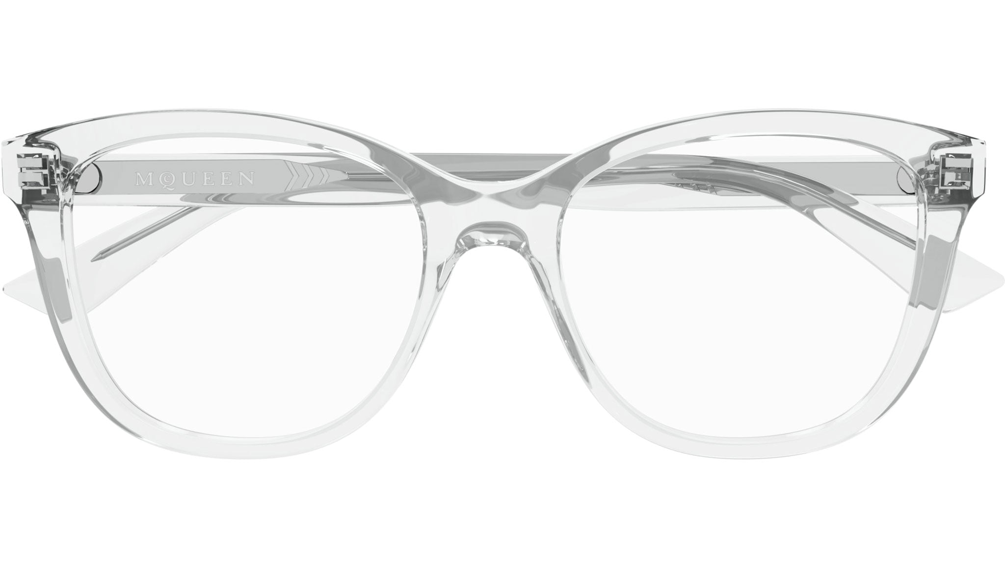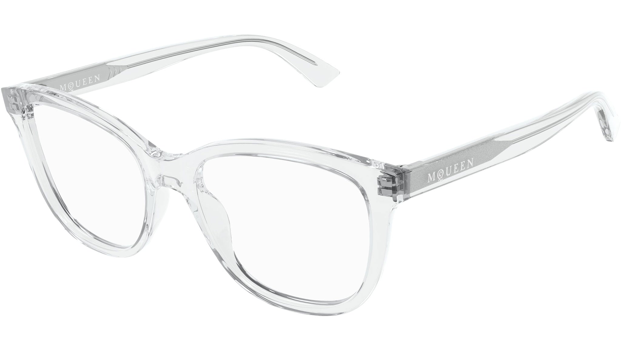 Occhiali da vista Alexander McQueen Casual Lines modello AM0487O in acetato riciclato a gatto codice colore 005 cristallo lucido con aste cristallo trasparente e lenti demo. Rivenditore autorizzato Alexander McQueen online. Gli occhiali vengono consegnati con custodia e accessori originali e sono coperti dalla garanzia ufficiale di 12 mesi del produttore.