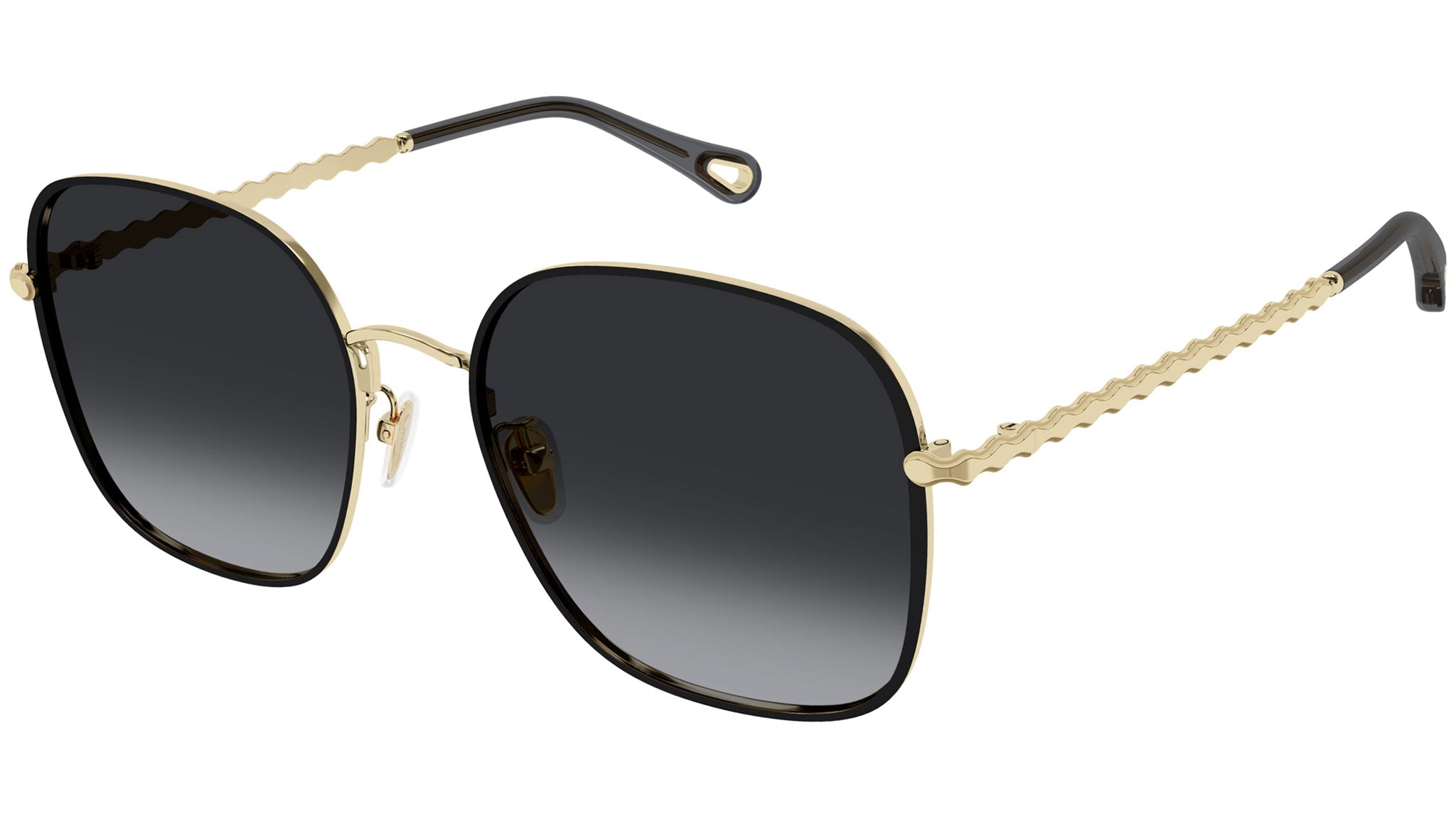 Occhiali da sole Chloé CH0255SK 001 donna con montatura rettangolare in metallo oro classico lucido + vernice nera solida lucida e lenti grigio sfumato. Linea: Chloé. Codice modello: CH0255SK. Codice colore: 001. Made in Japan. Rivenditore autorizzato Chloé online. Gli occhiali vengono consegnati con custodia e accessori originali e sono coperti dalla garanzia ufficiale di 12 mesi del produttore.