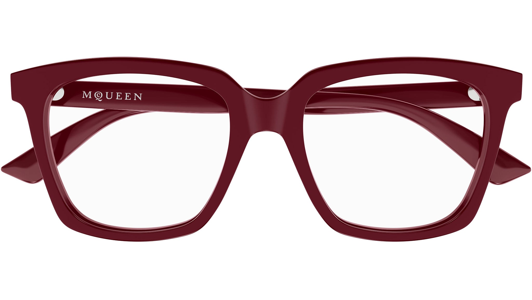 Occhiali da vista Alexander McQueen Logo modello AM0513O in acetato riciclato cat eye codice colore 005 bordeaux tinta unita lucido con aste bordeaux e lenti demo. Rivenditore autorizzato Alexander McQueen online. Gli occhiali vengono consegnati con custodia e accessori originali e sono coperti dalla garanzia ufficiale di 12 mesi del produttore.