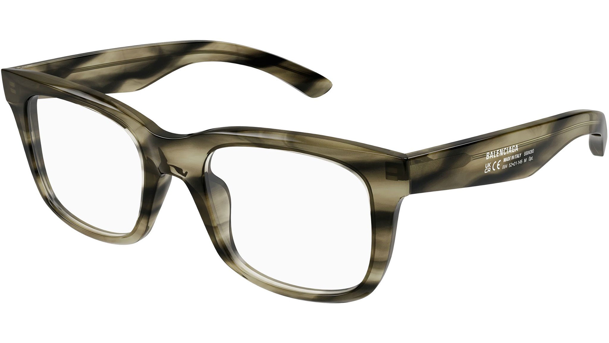Occhiali da vista Balenciaga BB0428O uomo con montatura rettangolare in acetato riciclato avana verde militare fiammato lucido e lenti demo. Linea: Everyday. Codice modello: BB0428O. Codice colore 54 mm: 009. 52 mm: 002. Made in Italy. Rivenditore autorizzato Balenciaga online. Gli occhiali vengono consegnati con custodia e accessori originali e sono coperti dalla garanzia ufficiale di 12 mesi del produttore.