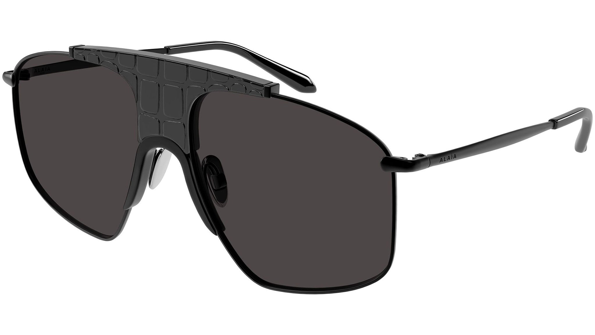 Occhiali da sole Azzedine Alaïa AA0098S 003 donna con montatura aviatore in metallo nero opaco, nero lucido con texture coccodrillo e lenti grigio tinta unita. Linea: Azzedine Alaïa. Codice modello: AA0098S. Codice colore: 003. Made in Japan. Rivenditore autorizzato Azzedine Alaïa online. Gli occhiali vengono consegnati con custodia e accessori originali e sono coperti dalla garanzia ufficiale di 12 mesi del produttore.