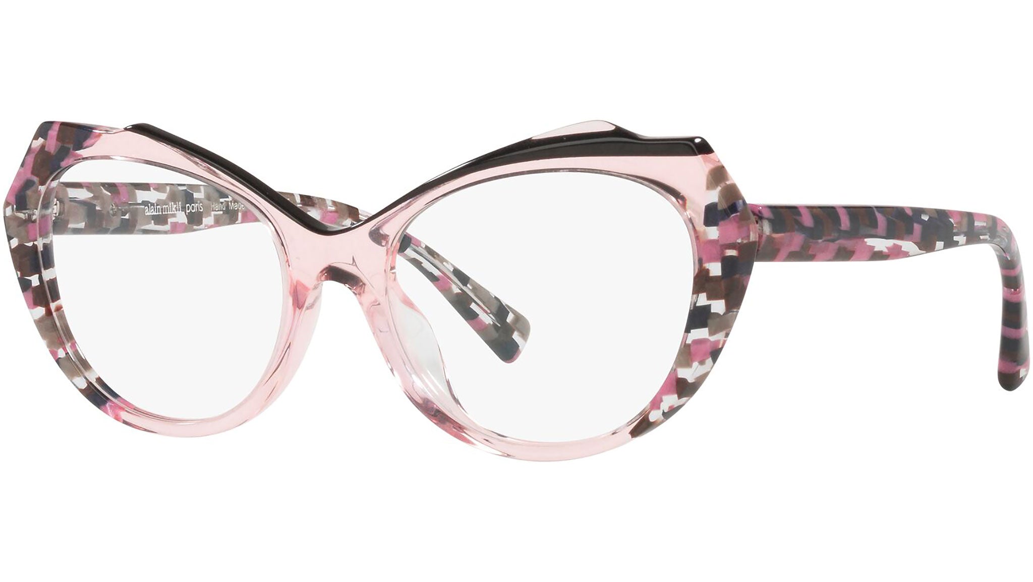 Occhiali da vista Alain Mikli modello A03136 codice colore 005, variante colore rosa traslucido nero e scacchiera. Alain Mikli è stato il primo marchio a sostenere l’idea di occhiale come accessorio. Dalla fusione di arte e moda nascono montature da sempre sinonimo di unicità e provocazione, contraddistinte per il design originale e le combinazioni di colori esclusive.