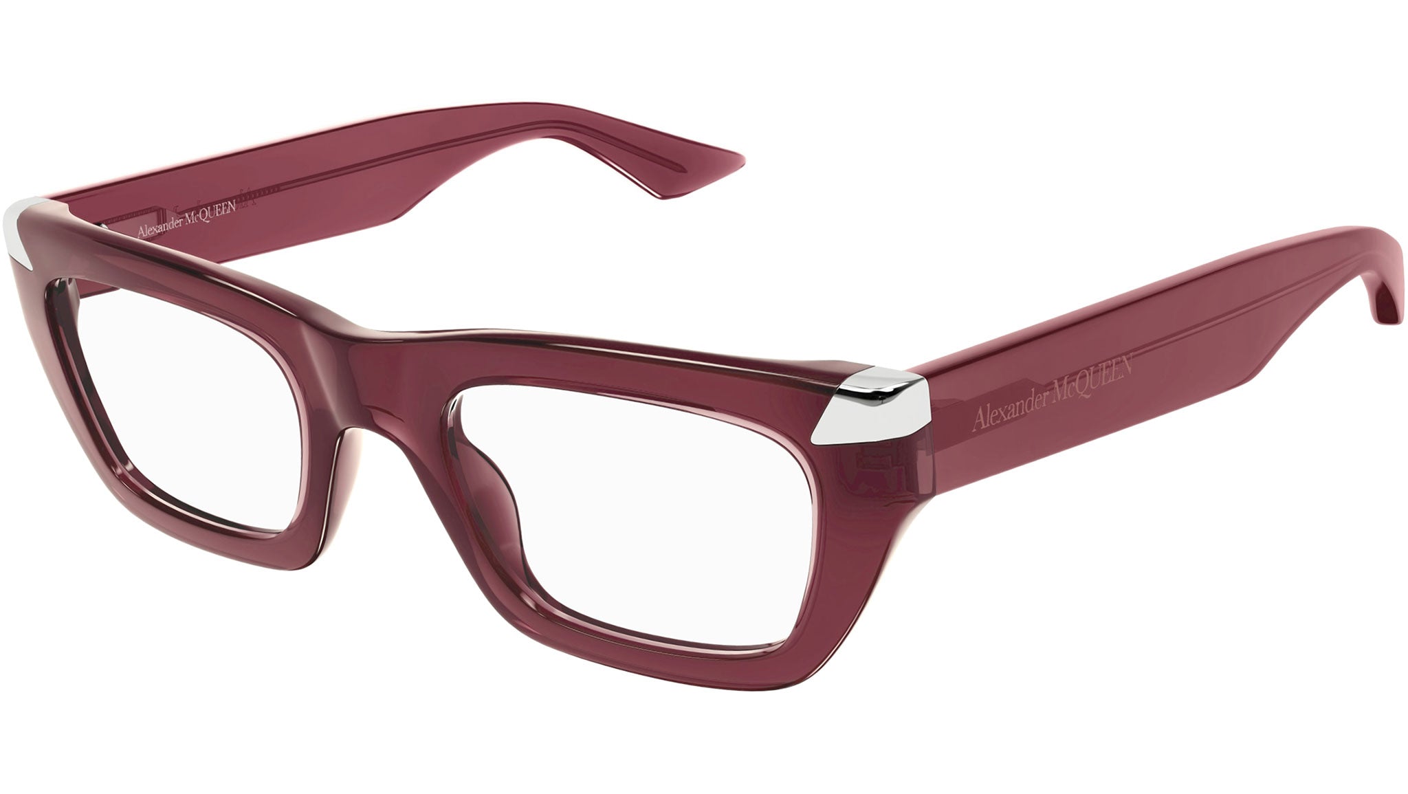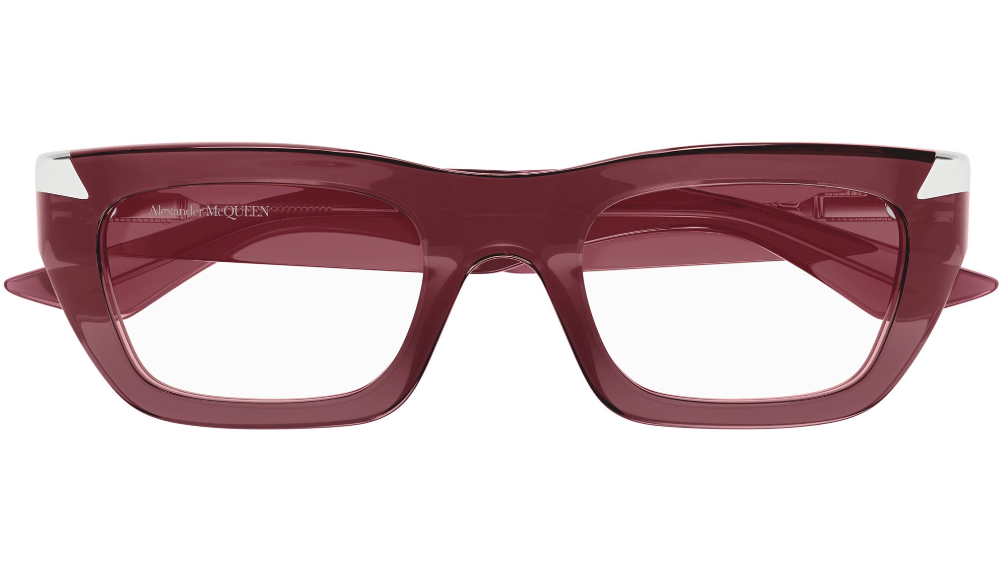 Occhiali da vista Alexander McQueen Icons modello AM0444O rectangle in acetato riciclato codice colore 003 borgogna trasparente lucido con aste rosso borgogna e lenti demo.