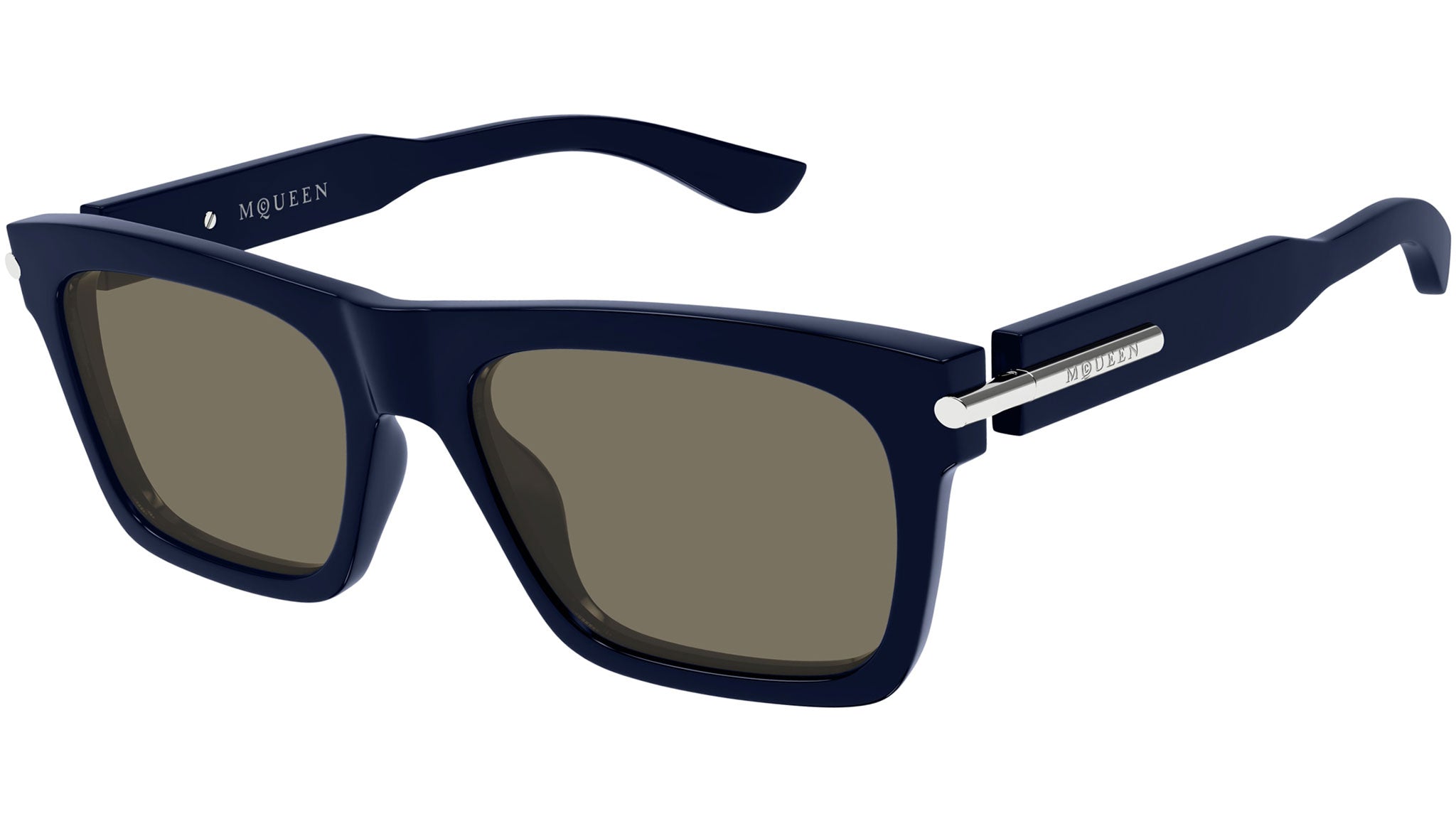Occhiali da sole Alexander McQueen T-Bar modello AM0495S in acetato riciclato rettangolari codice colore 004 blu lucido tinta unita con aste blu e lenti color marrone tinta unita. Rivenditore autorizzato Alexander McQueen online. Gli occhiali vengono consegnati con custodia e accessori originali e sono coperti dalla garanzia ufficiale di 12 mesi del produttore.