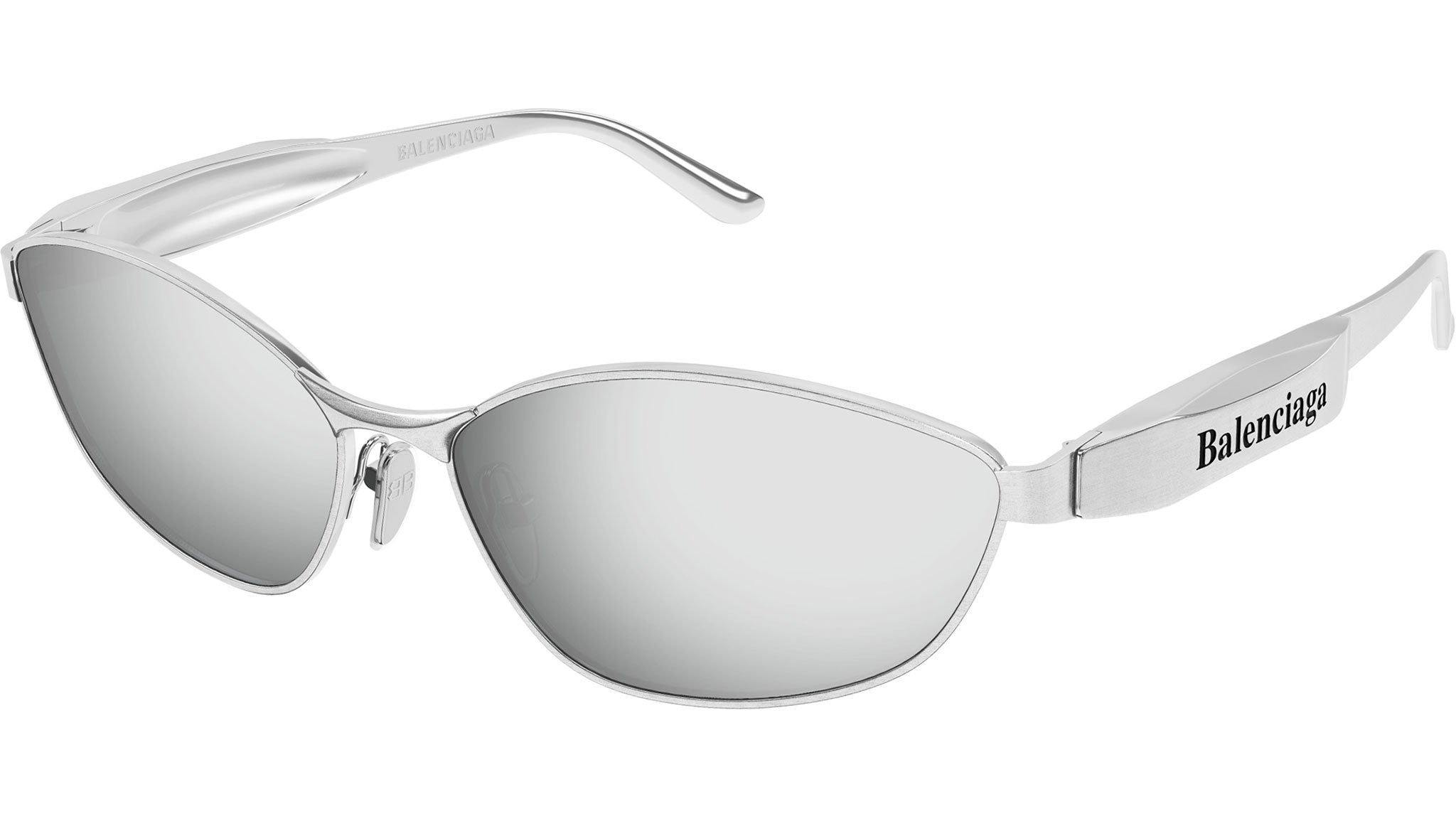 Occhiali da sole Balenciaga modello BB0356S linea Everyday codice colore 004 argento spazzolato orizzontale lucido in metallo forma a gatto con aste color argento e lenti color argento + grigio tinta unita. Rivenditore autorizzato Balenciaga online. Gli occhiali vengono consegnati con custodia e accessori originali e sono coperti dalla garanzia ufficiale di 12 mesi del produttore.
