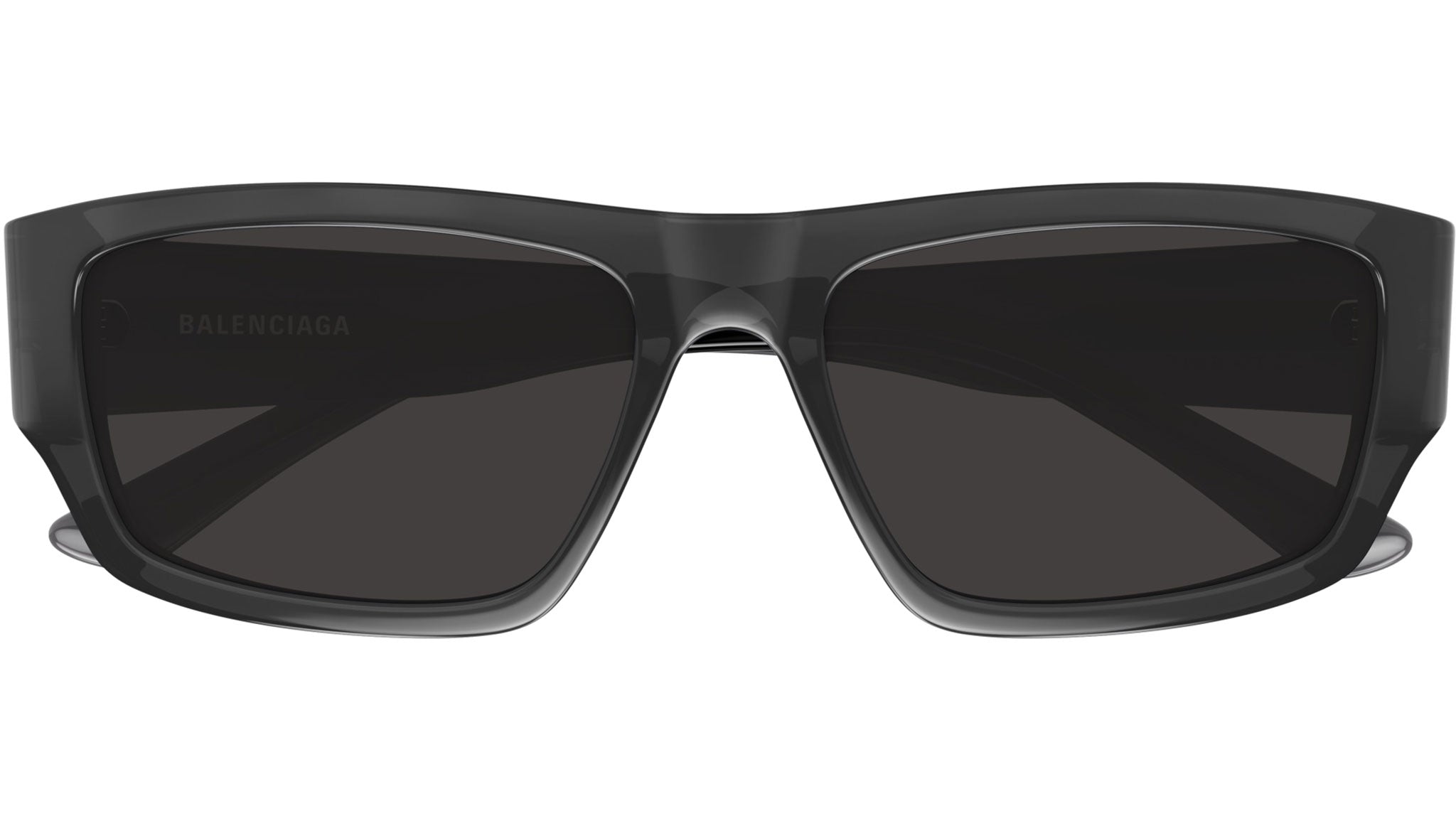 Occhiali da sole Balenciaga modello BB0366S linea Everyday codice colore 004 grigio scuro trasparente lucido in acetato riciclato forma rettangolare con aste color grigio e lenti color grigio tinta unita. Rivenditore autorizzato Balenciaga online. Gli occhiali vengono consegnati con custodia e accessori originali e sono coperti dalla garanzia ufficiale di 12 mesi del produttore.