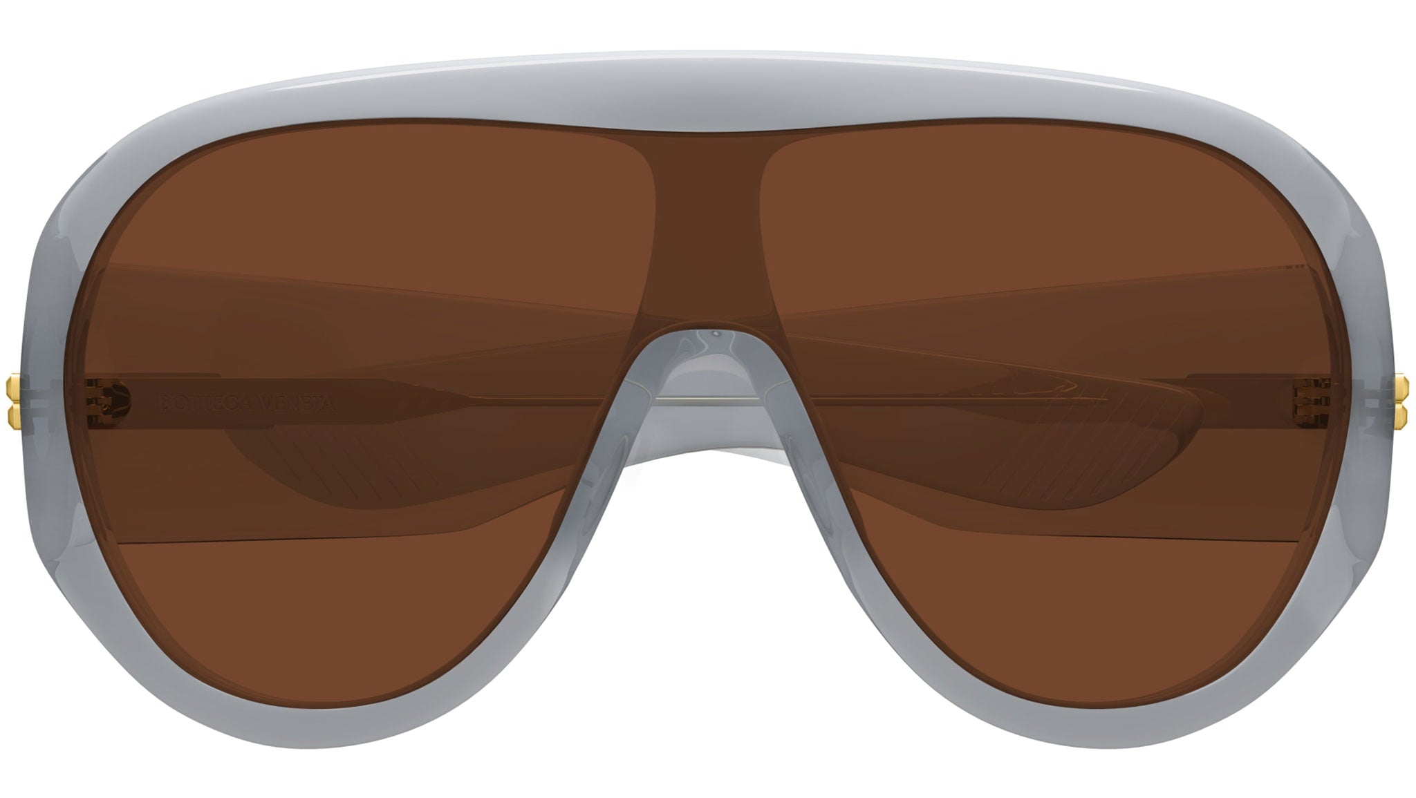 Occhiali da sole Bottega Veneta modello BV1345S in acetato riciclato forma mascherina codice colore 004 grigio chiaro trasparente lucido con lenti color marrone chiaro tinta unita. Rivenditore autorizzato Bottega Veneta online. Gli occhiali vengono consegnati con custodia e accessori originali e sono coperti dalla garanzia ufficiale di 12 mesi del produttore.