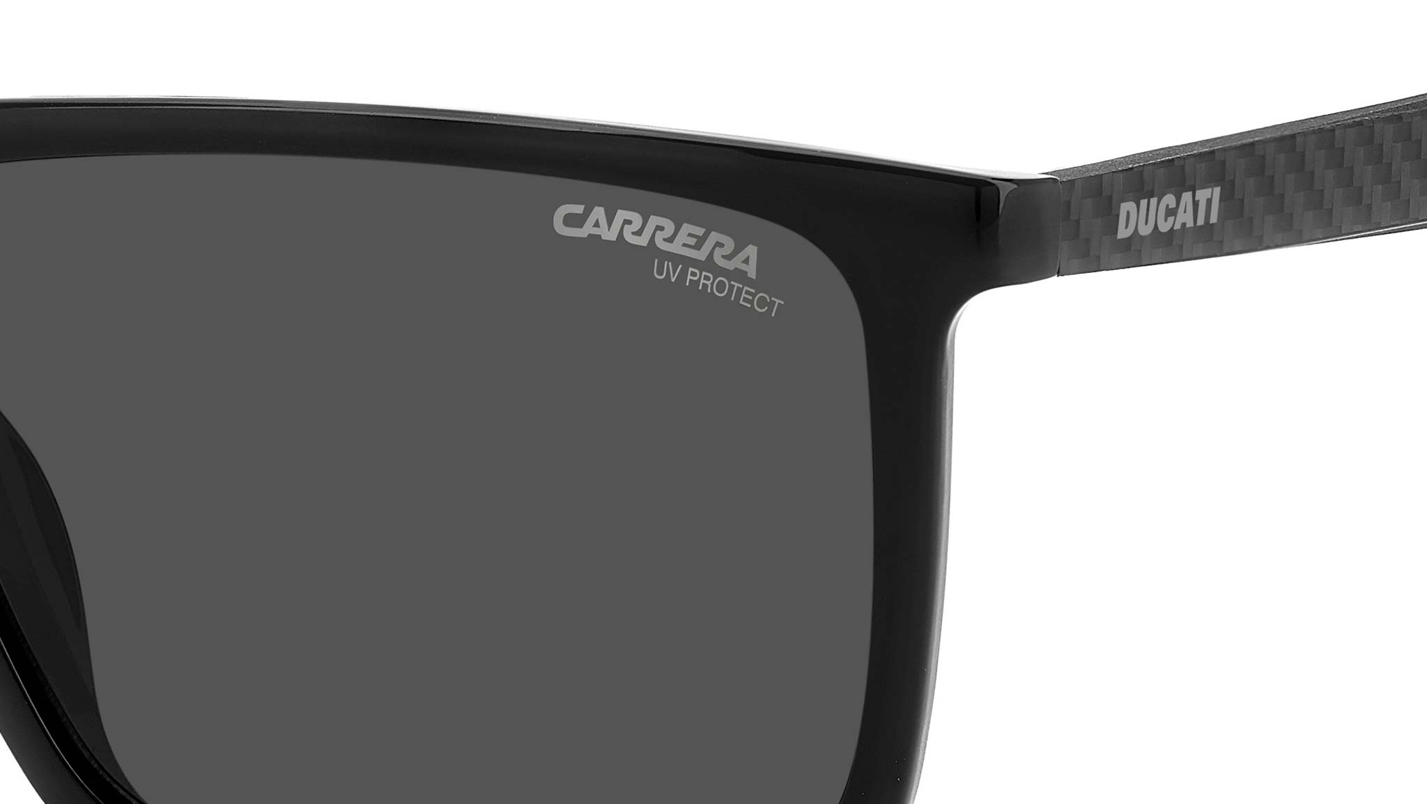 Occhiali da sole Carrera Ducati modello CarDuc 023/S colore 807 IR black. Fuoriclasse in pista come nelle giornate di relax, questo occhiale da sole combina materiali e cifre stilistiche comuni al mondo Carrera e al mondo Ducati. Gli intenditori riconosceranno l’innovazione nelle aste: iconiche nel design, omaggio alla Panigale, performanti grazie alla fibra di carbonio, materiale dalle qualità tecniche superiori. Il frontale squadrato è progettato per montare lenti da sole graduate, disponibili anche in versione specchiata e ultrapolar.