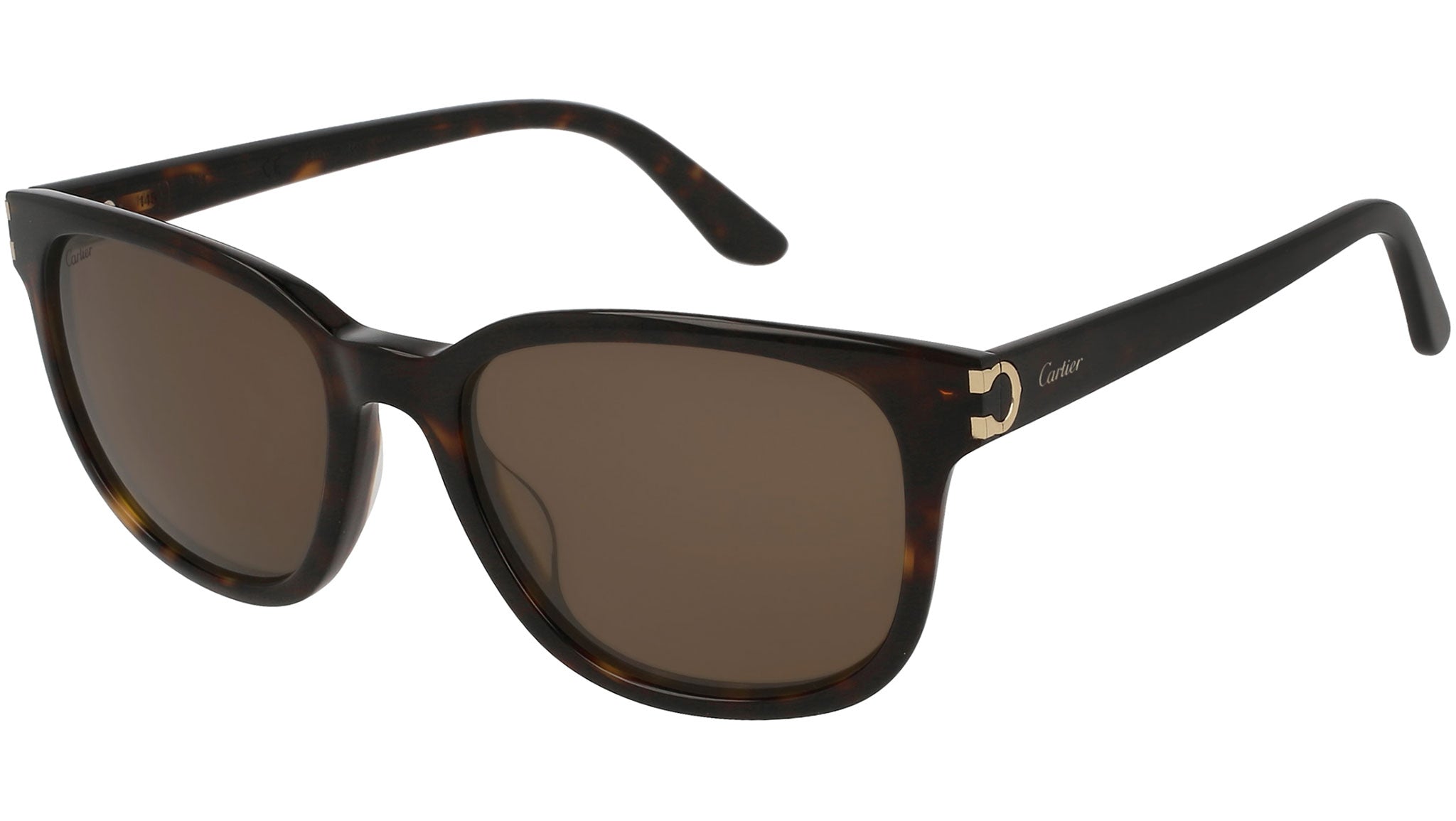 Occhiali da sole Cartier linea Initiation modello CT0002S in acetato rettangolare codice colore 002 tartaruga scuro lucido con aste tartaruga e lenti marrone solido + AR interno azzurro.