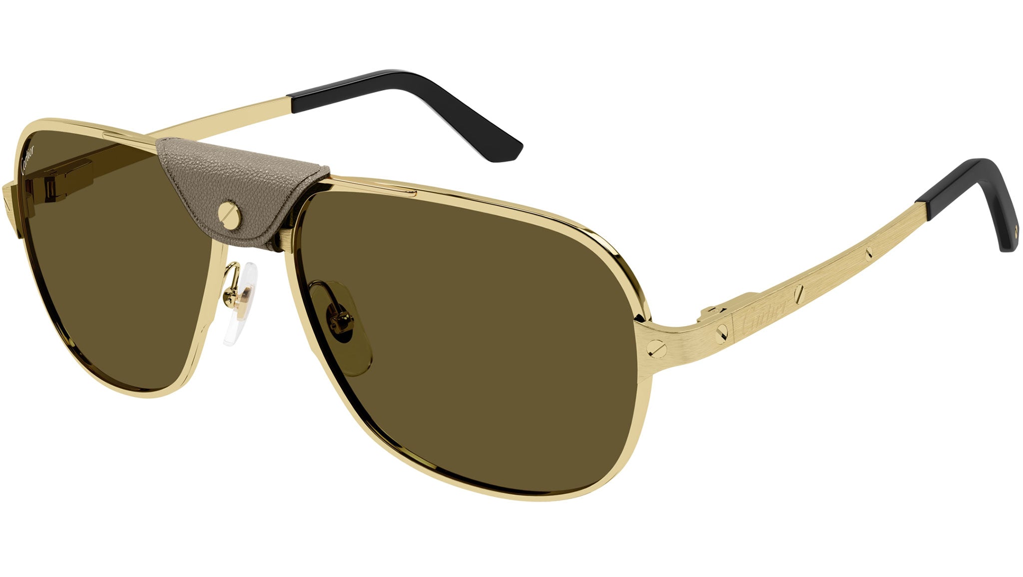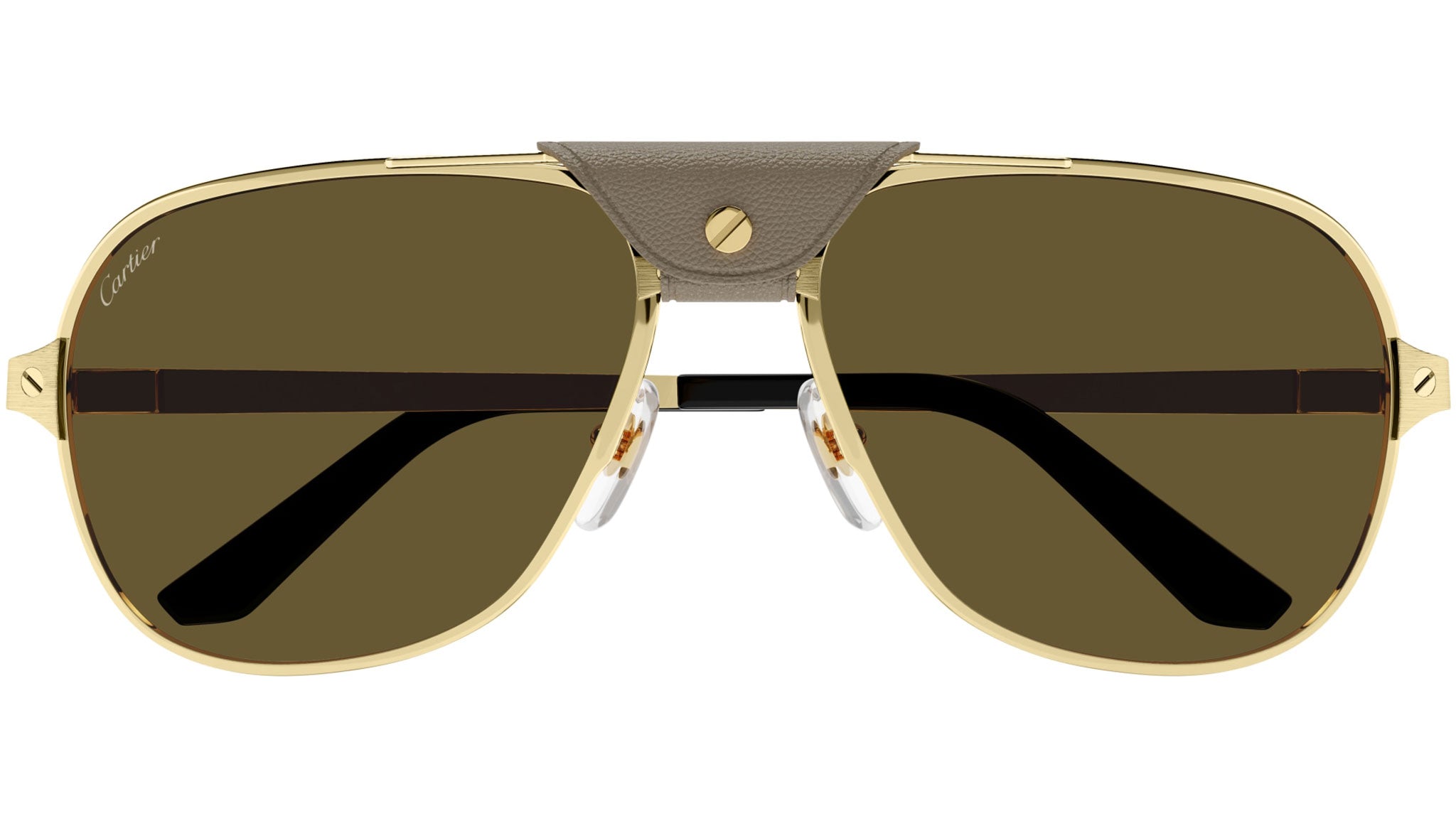 Occhiali da sole Cartier linea Core Range modello CT0165S aviator in metallo codice colore 011 finitura oro levigato spazzolato / pelle beige con aste oro e lenti color marrone polarizzato.