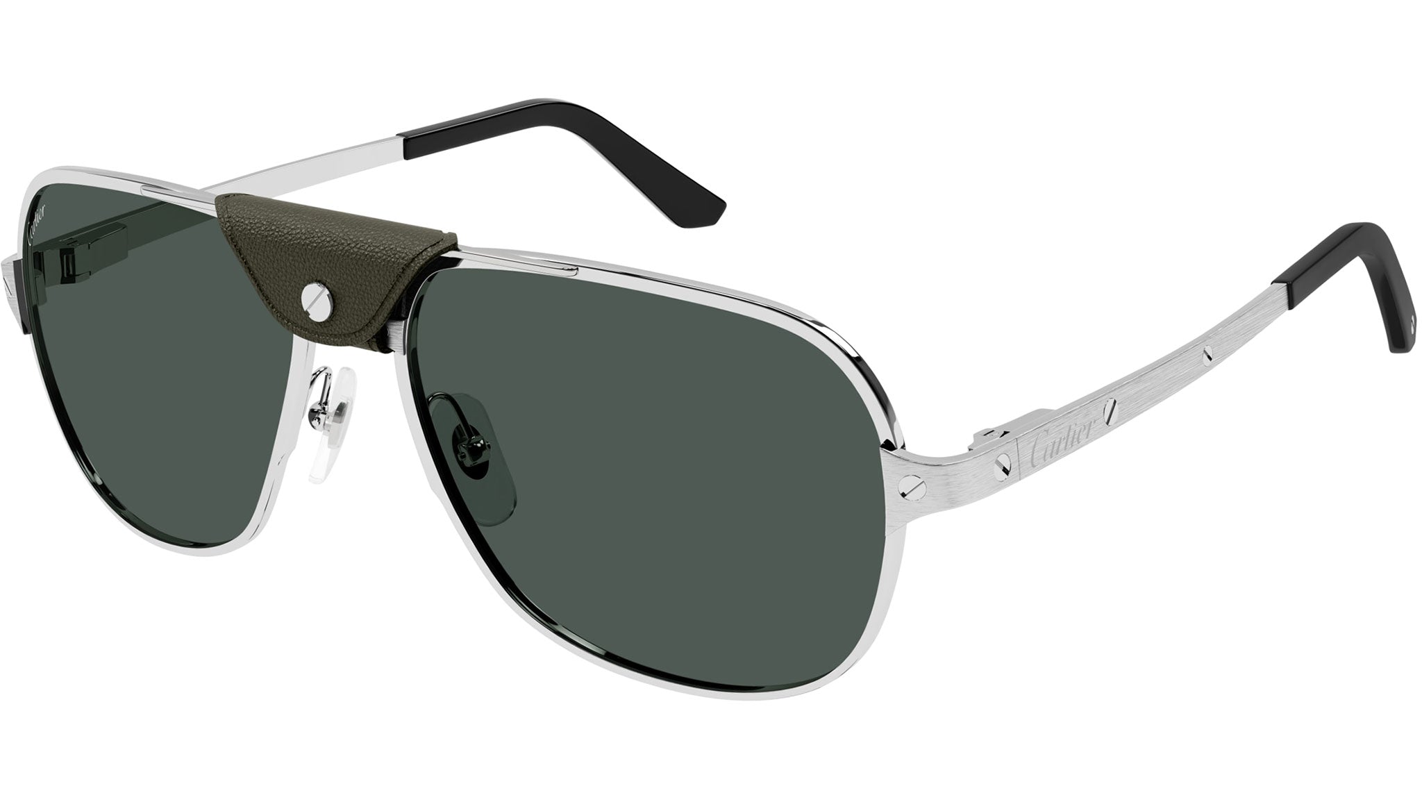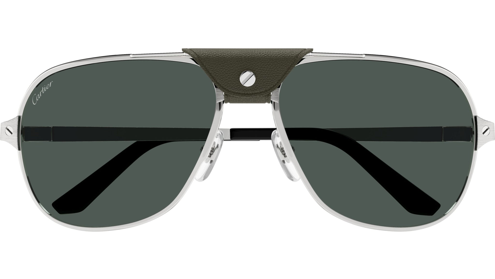 Occhiali da sole Cartier linea Core Range modello CT0165S aviator in metallo codice colore 012 finitura platino levigato spazzolato / pelle verde con aste argento e lenti color verde.