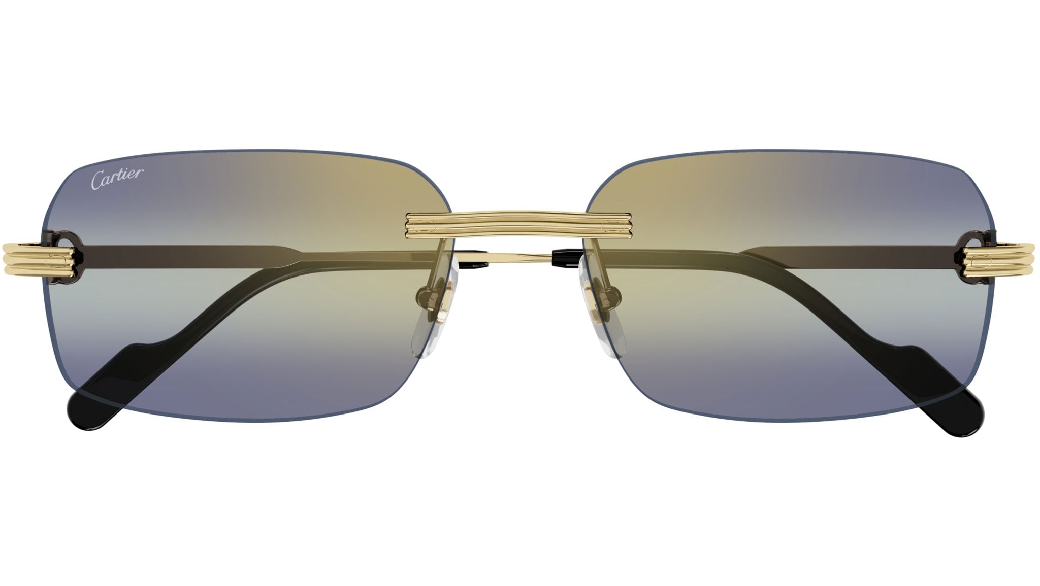 Occhiali da sole Cartier linea Core Range modello CT0271S rectangle in metallo codice colore 006 oro finitura smooth con aste oro e lenti color verde sfumato viola con flash oro.