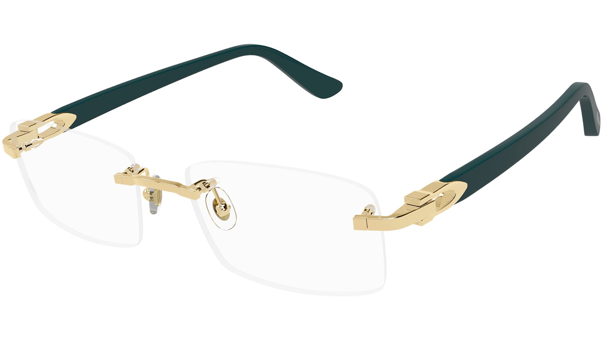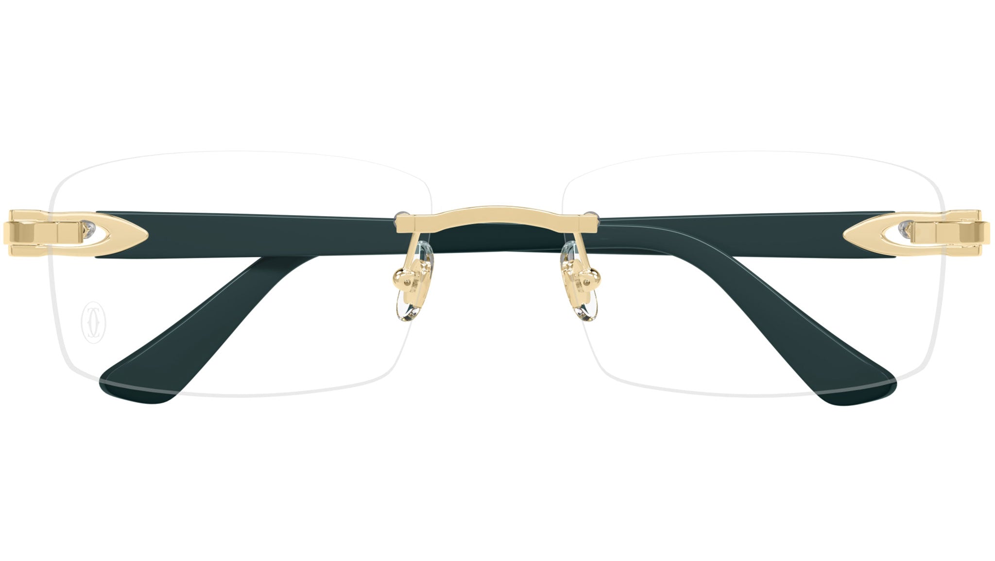 Occhiali da vista Cartier linea Core Range modello CT0287O in metallo rettangolare codice colore 009 oro finitura smooth con asta verde e lenti demo da materiale riciclato con strato HR e filtro AR blu.