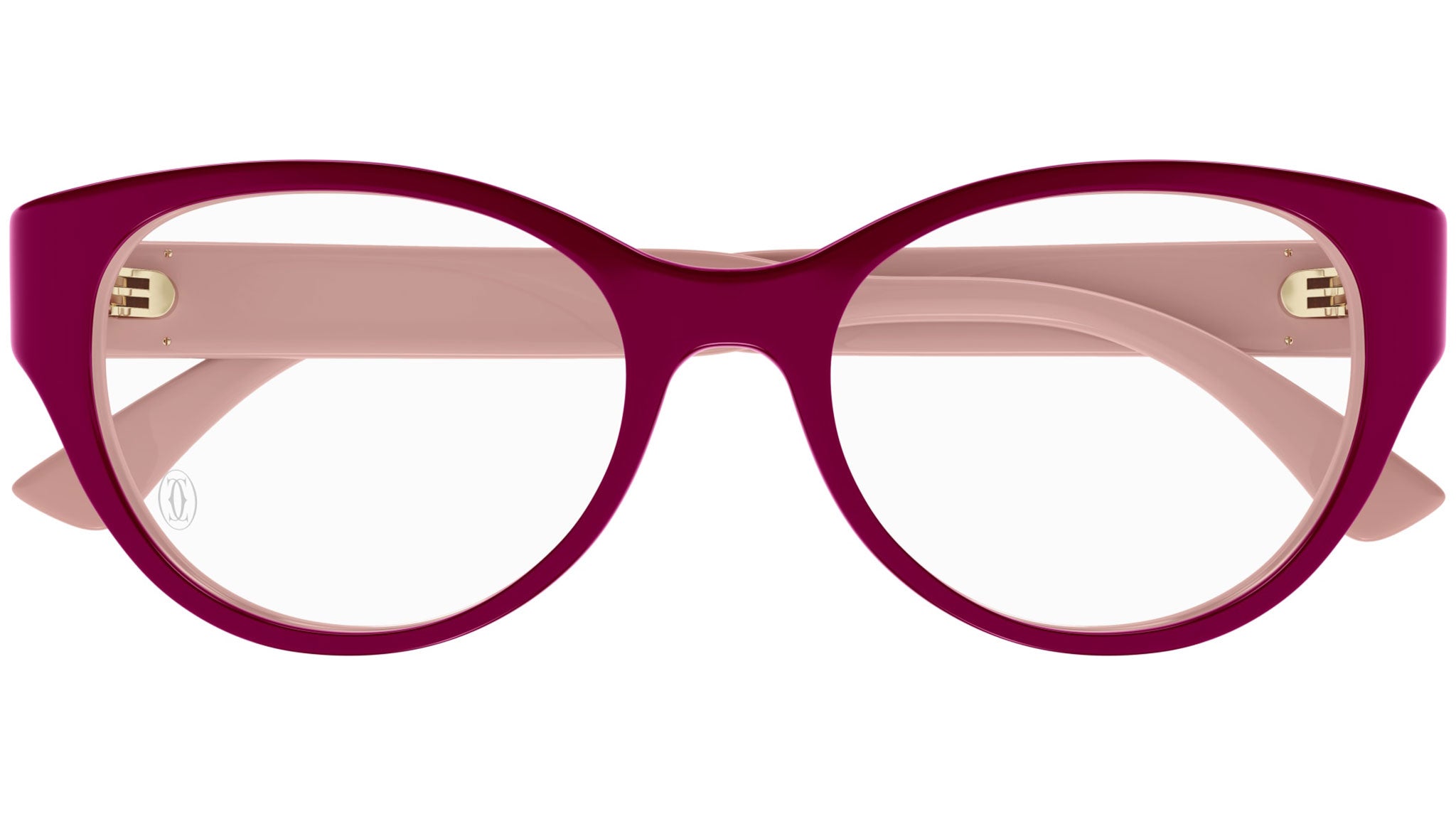 Occhiali da vista Cartier linea Initiation modello CT0315O variante colore 006 bordeaux e nude bilayer con astine color rosso borgogna.