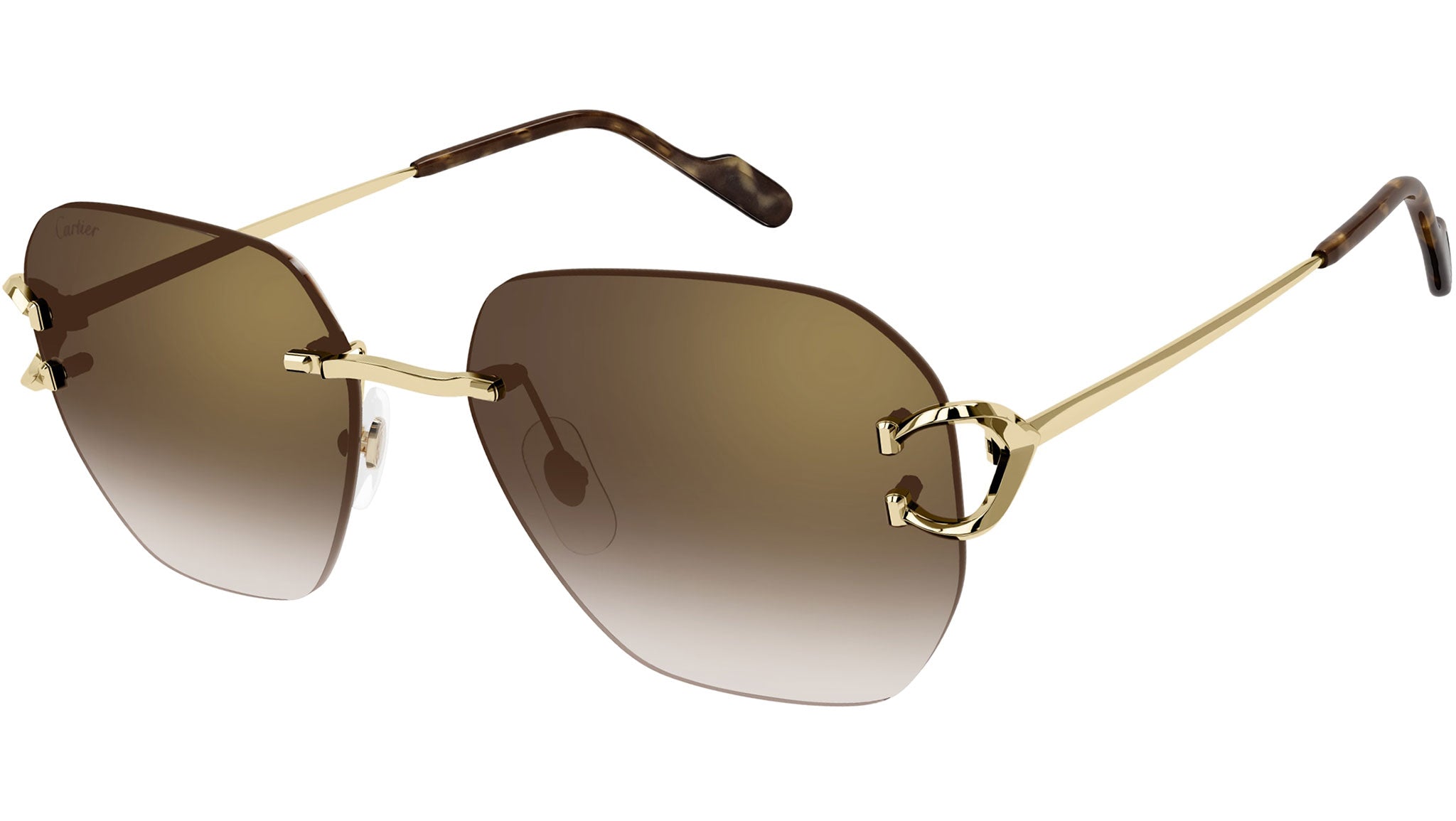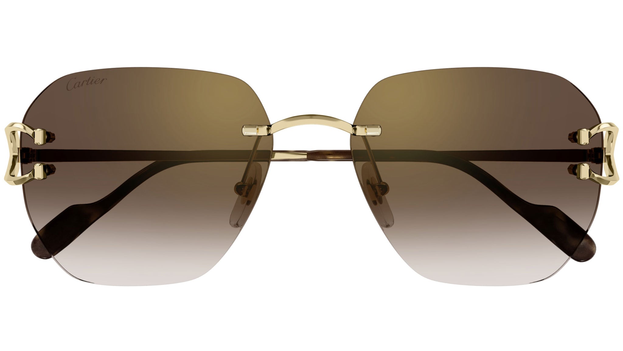 Occhiali da sole Cartier linea Core Range CT0394S variante colore 002 con montatura oro finitura smooth e lenti color marrone sfumato con flash oro.