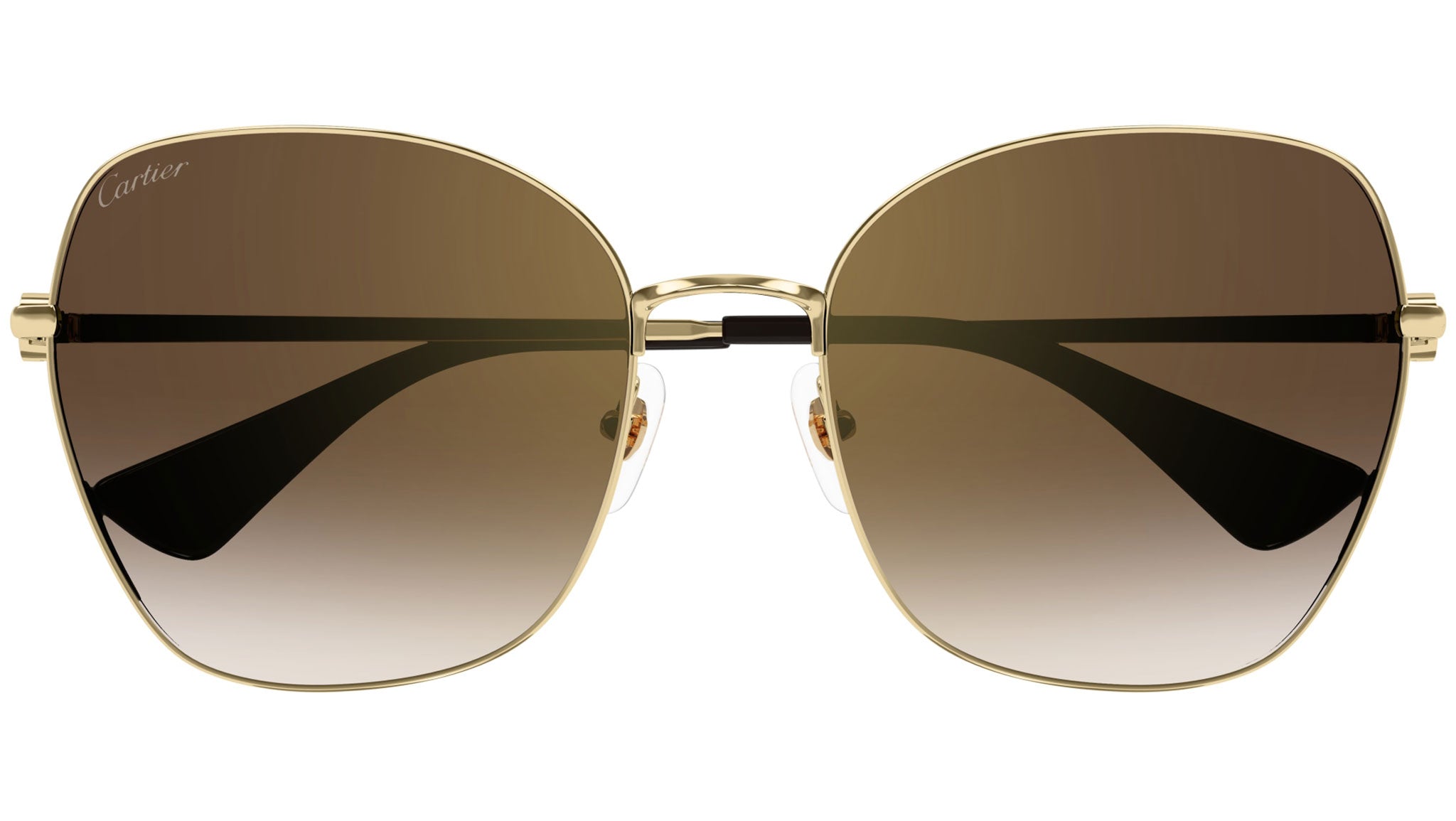 Occhiali da sole Cartier linea Core Range CT0402S 002 con montatura oro finitura smooth e lenti color marrone sfumato con flash oro.