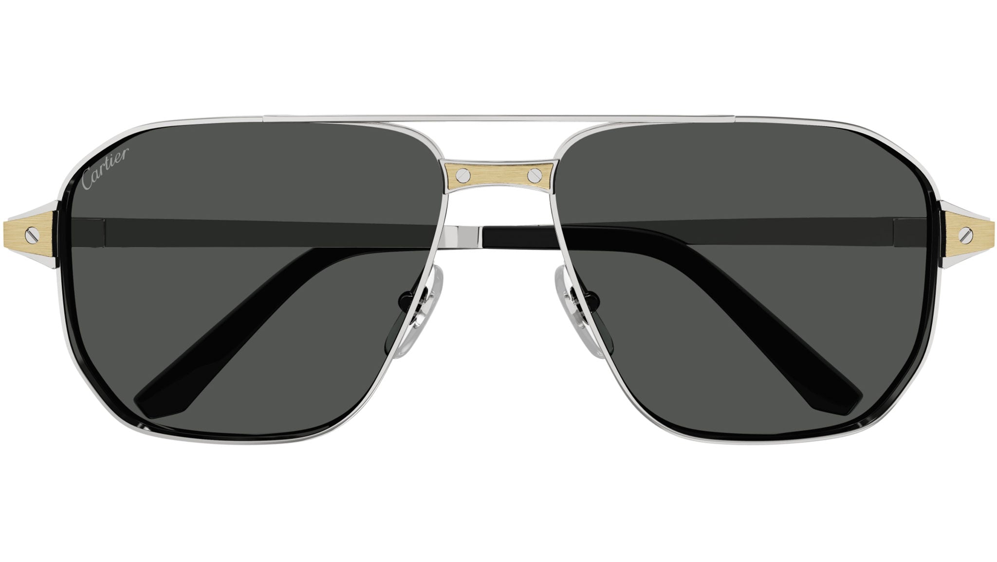 Occhiali da sole Cartier linea Exception modello CT0424S aviator in metallo codice colore 001 platino finitura levigata con inserti champagne con aste argento e lenti color nero polarizzato.