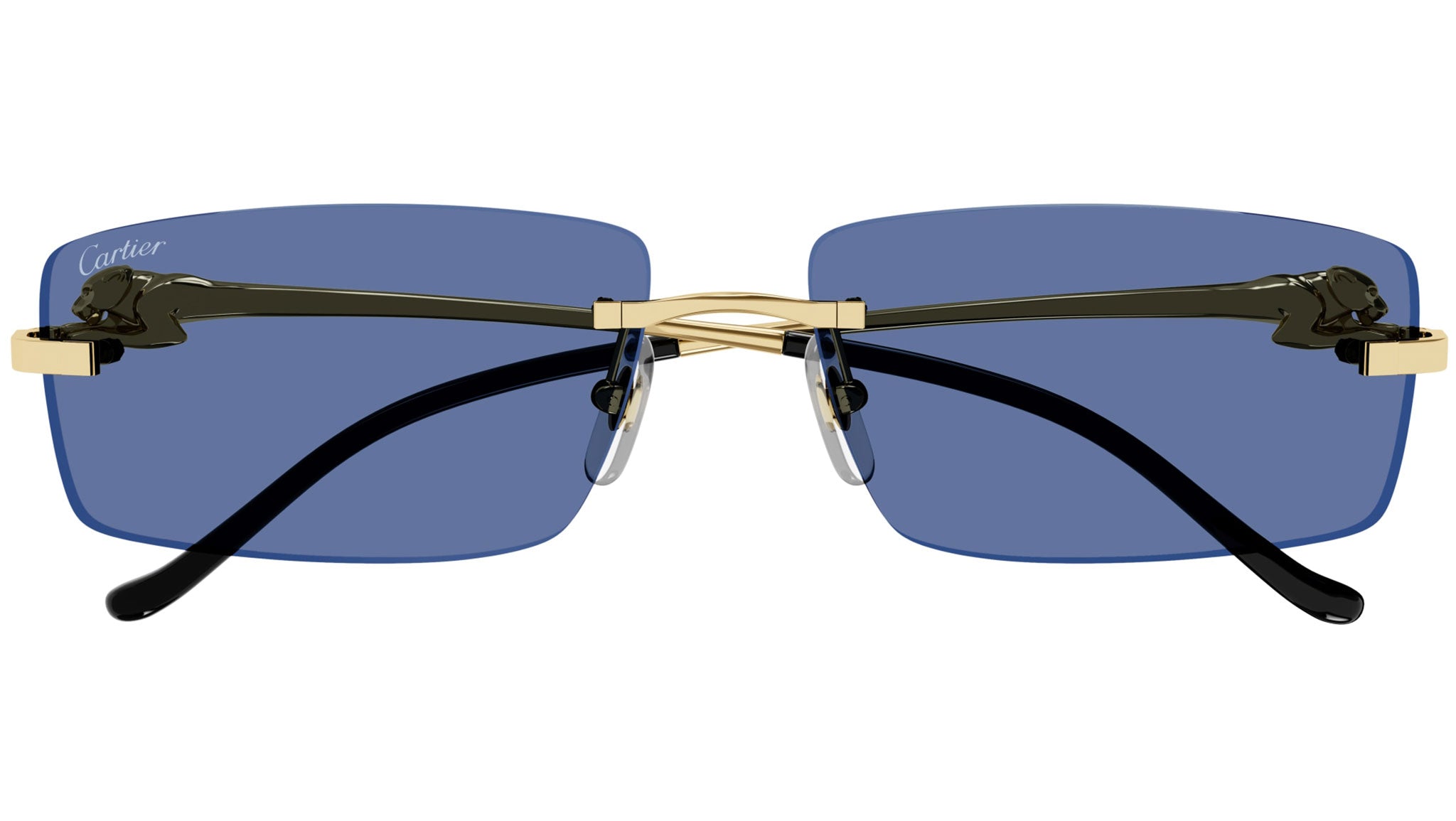 Occhiali da sole Cartier linea Core Range modello CT0430S rectangle in metallo codice colore 004 oro finitura smooth con aste oro e lenti color blu.