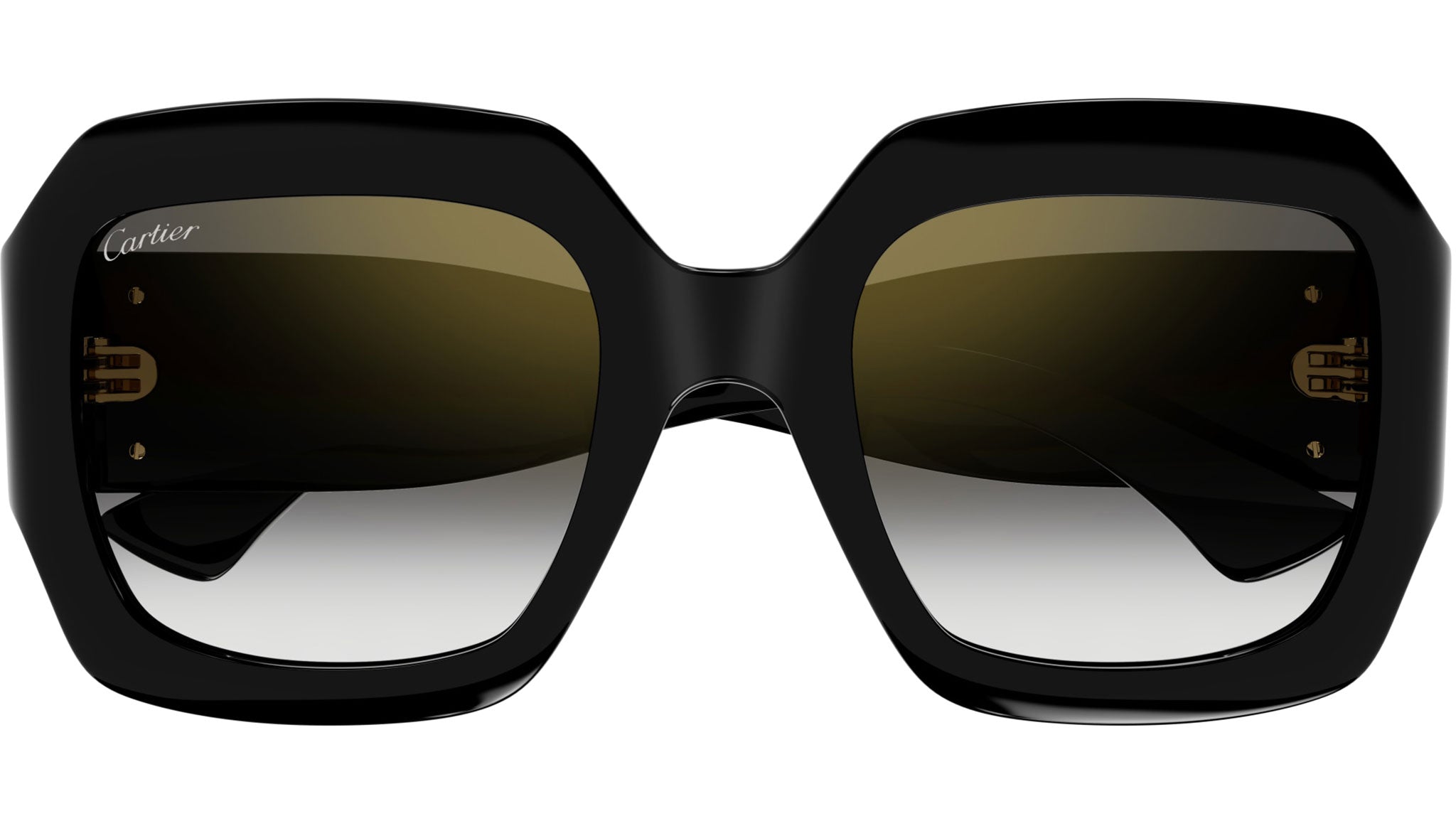Occhiali da sole Cartier linea Contemporary modello CT0434S rectangle in acetato riciclato codice colore 001 nero con aste nero e lenti color grigio sfumato con flash dorato.