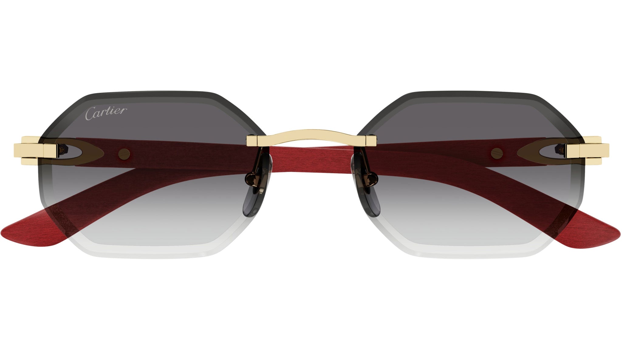 Occhiali da sole Cartier linea Exception modello CT0439S geometric in metallo codice colore 003 oro finitura smooth con aste rosso e lenti color grigio sfumato.