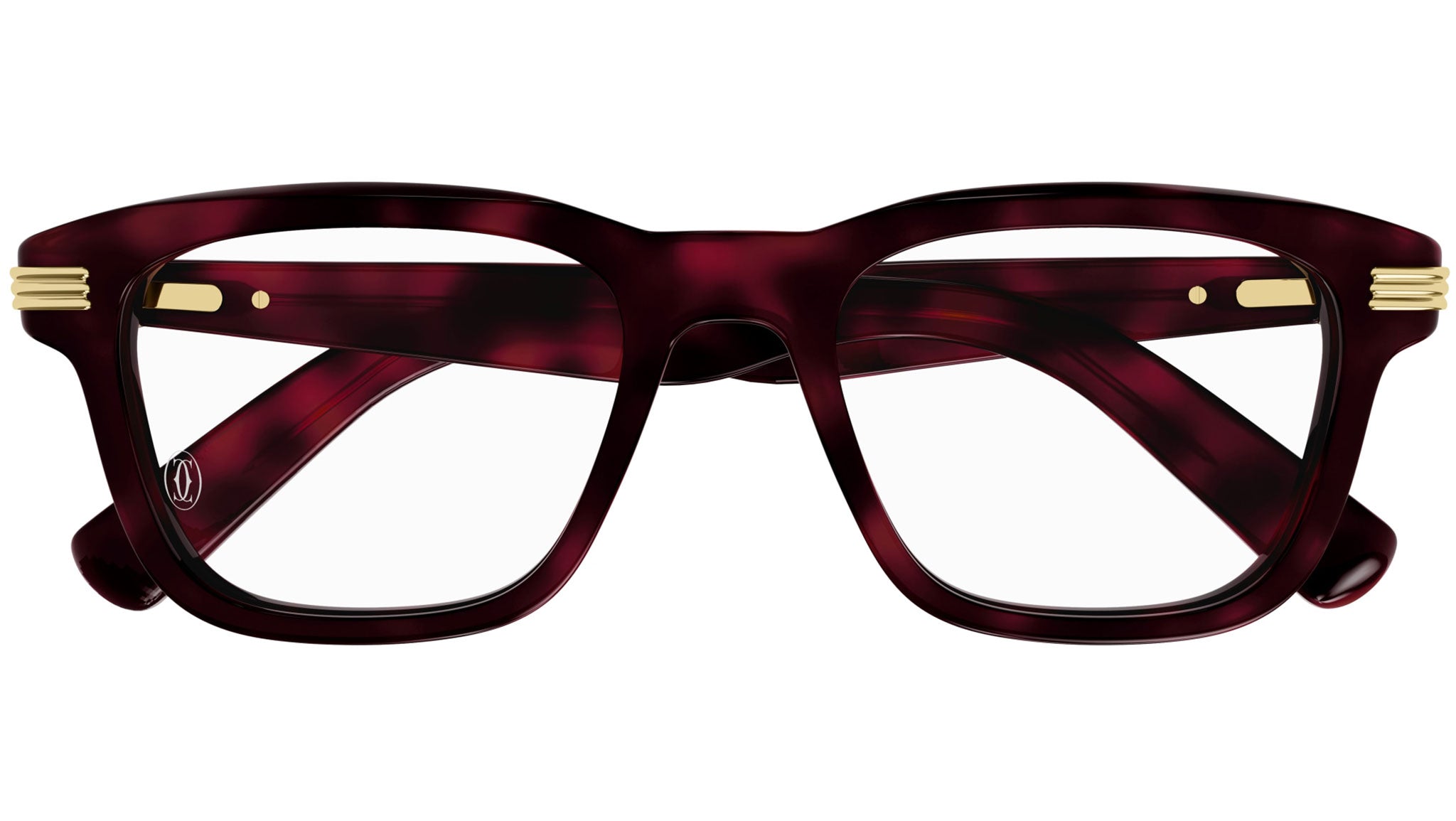 Occhiali da vista Cartier Core Range modello CT0444O rectangle in acetato riciclato codice colore 004 borgogna effetto tartarugato con aste tartaruga e lenti demo da materiale riciclato con strato HR e filtro AR blu.