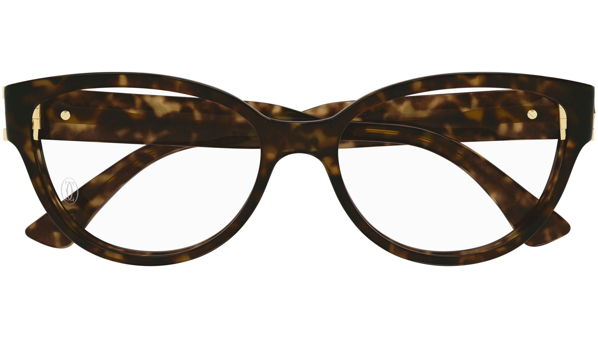 Occhiali da vista Cartier Contemporary modello CT0450O cat eye in acetato riciclato codice colore 002 tartaruga scuro con aste tartaruga e lenti demo da materiale riciclato con strato HR e filtro AR blu.